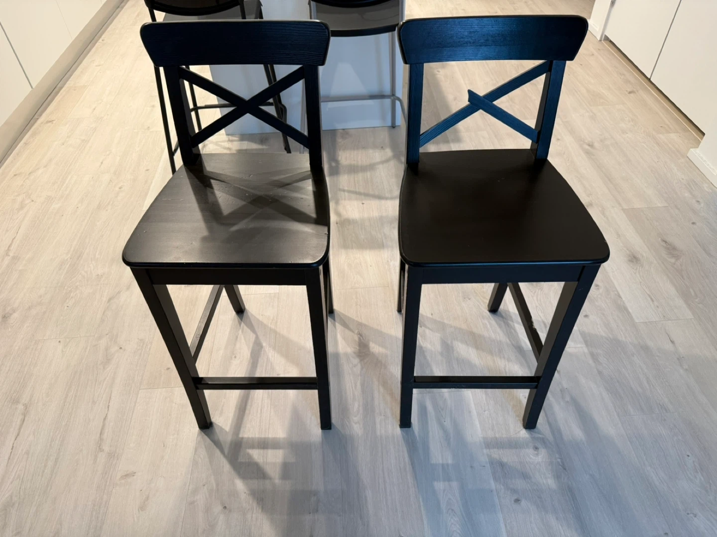 These black wooden bar stools have a classic X-back design. They're sturdy and made of wood. This style of stool works well in a kitchen or at a bar.
