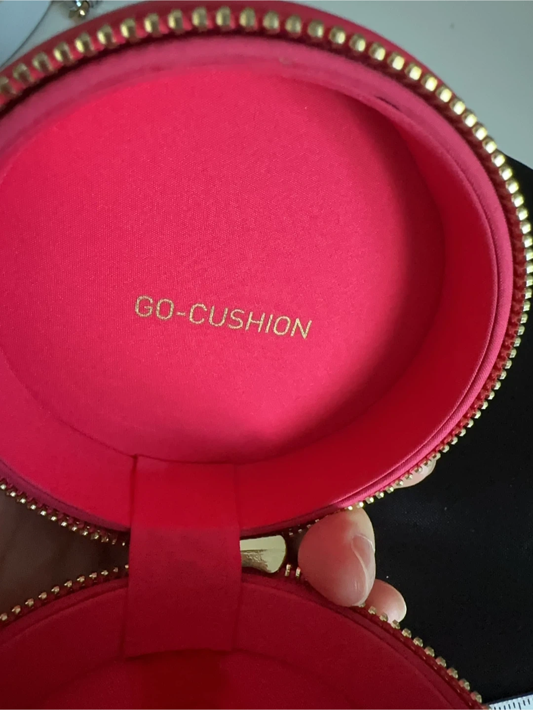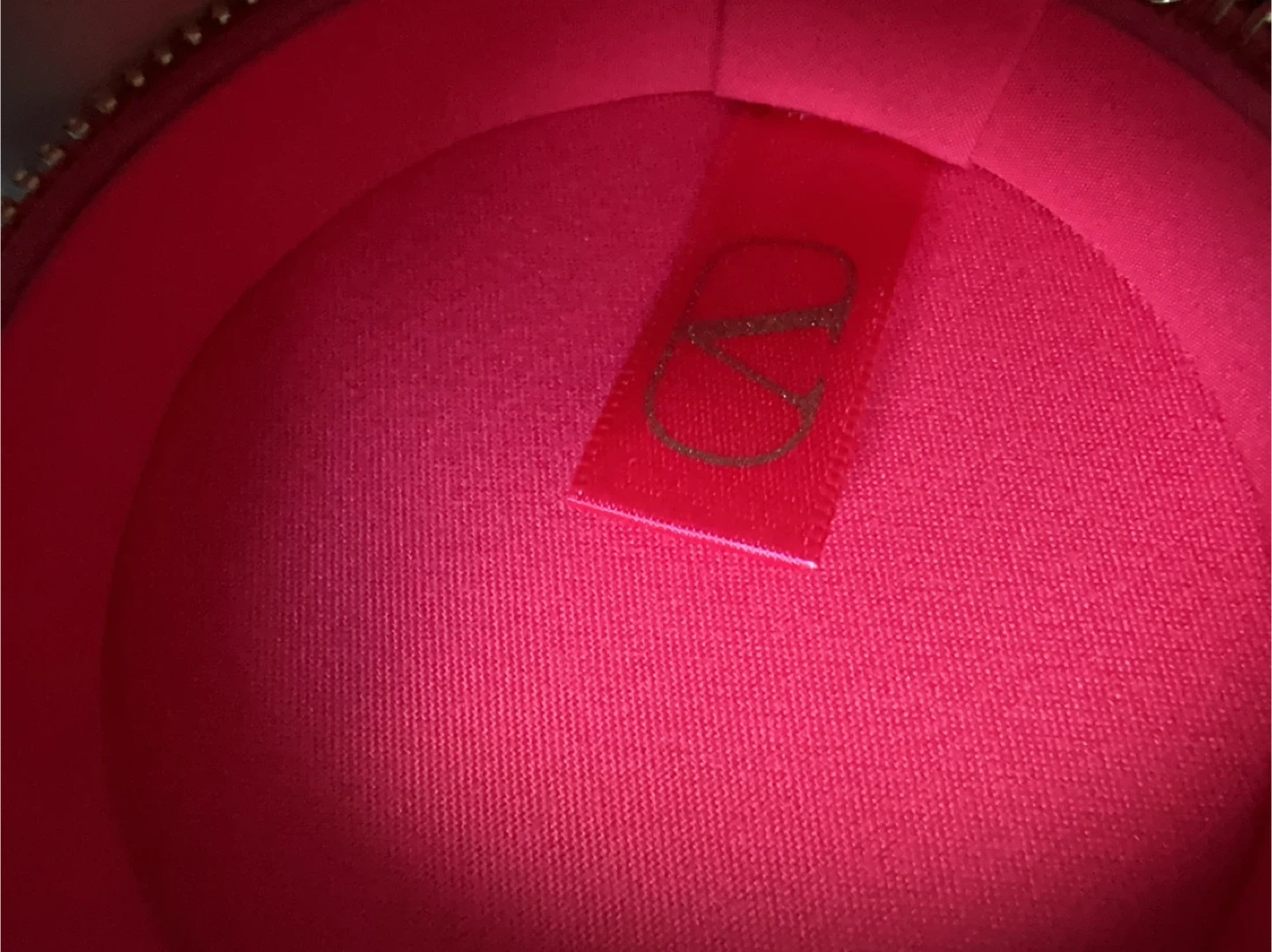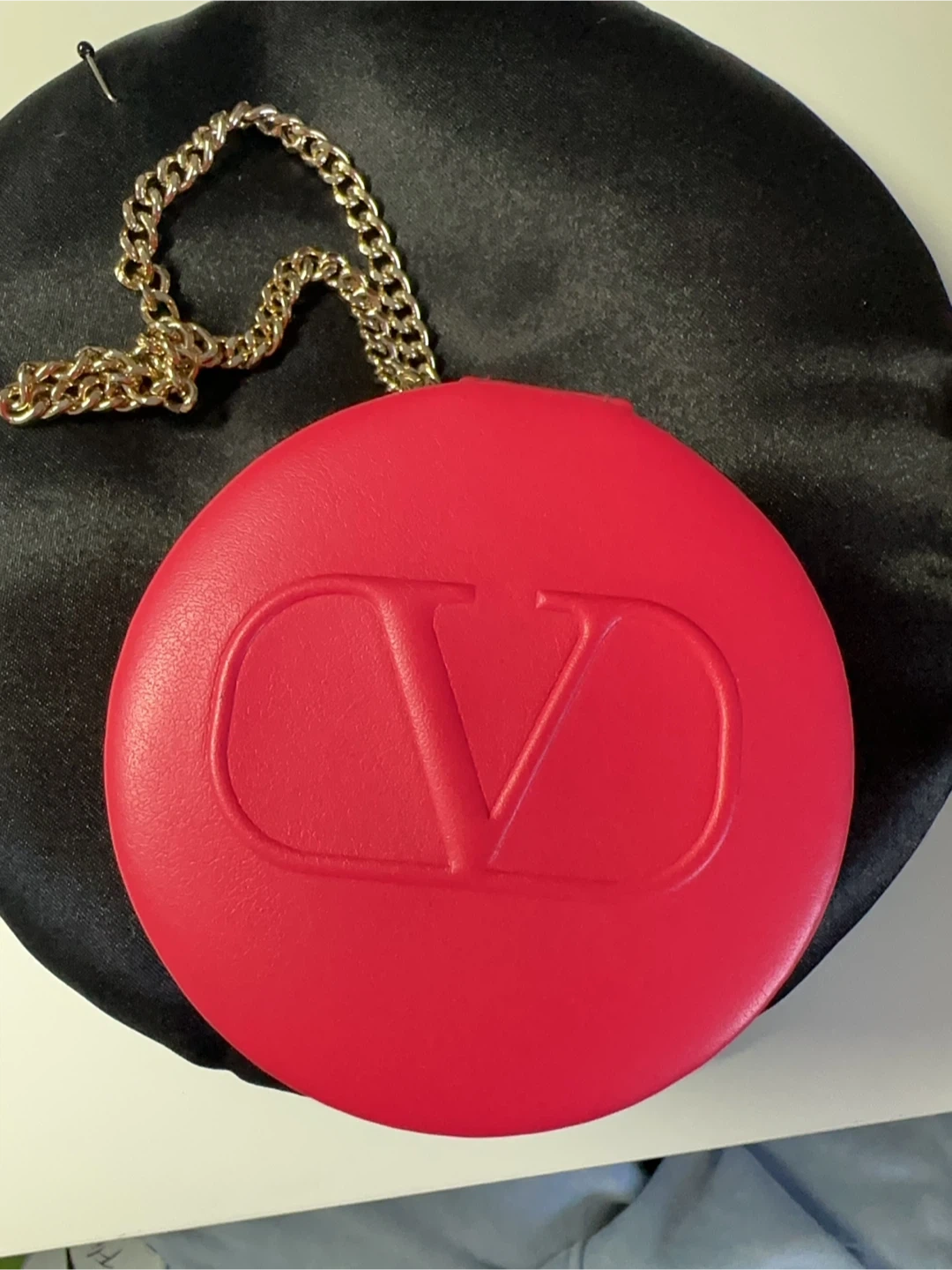 This pink round cosmetic case features the iconic Valentino "V" logo embossed on the outside. It's labelled "GO-CUSHION" inside and has a zipper closure with a gold chain strap. Its compact size makes it handy for travel or on-the-go touch-ups!
