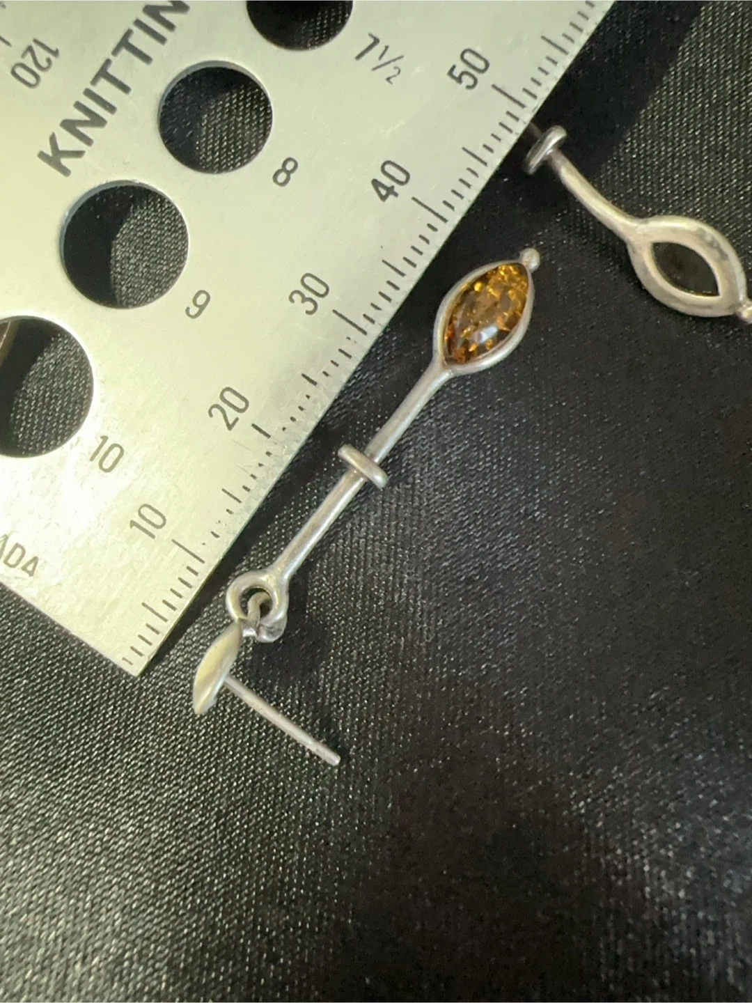 A pair of sterling silver dangle earrings with amber stones. The earrings have a unique elongated shape with a small silver accent. Includes clear plastic earring backs.