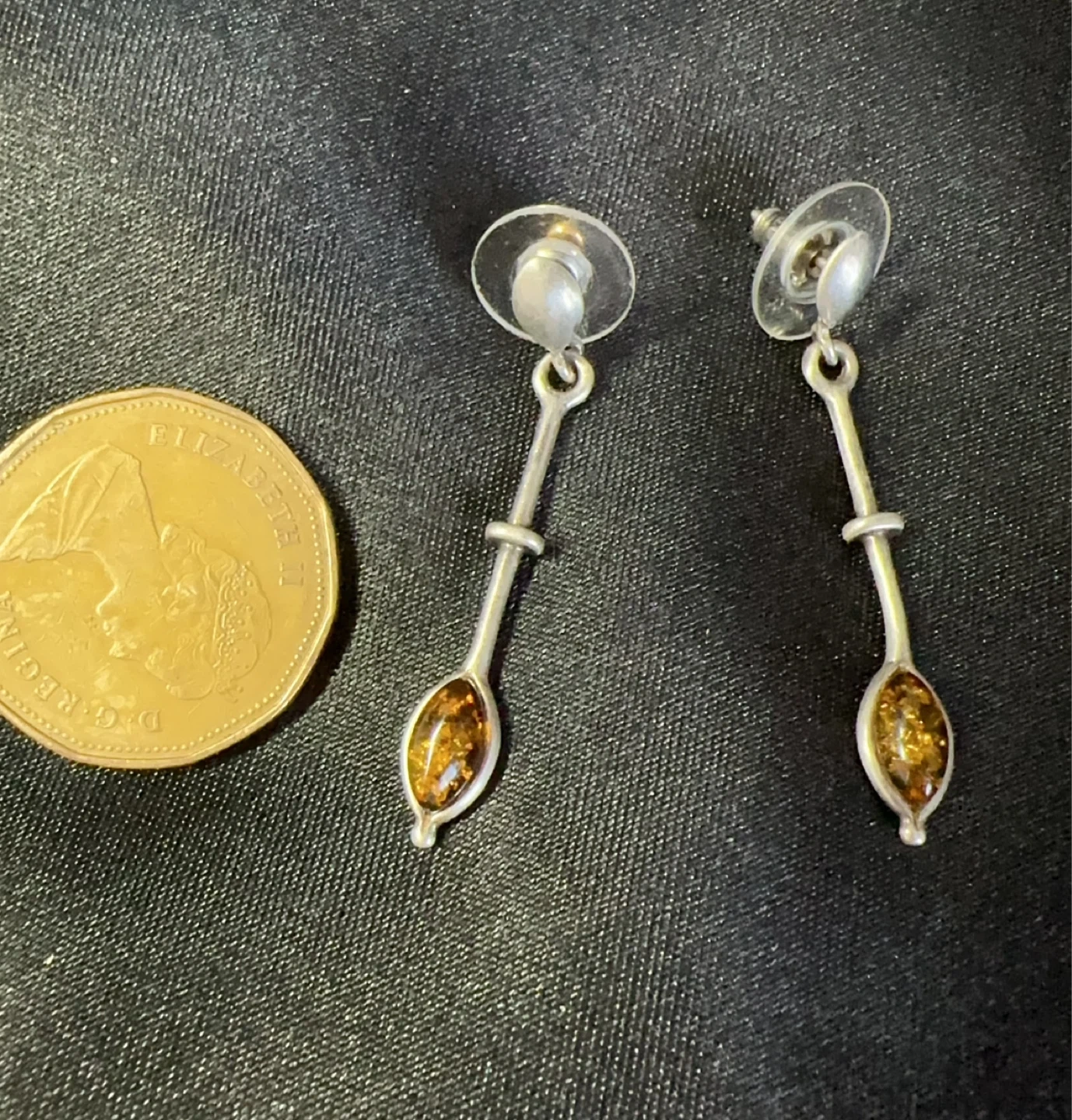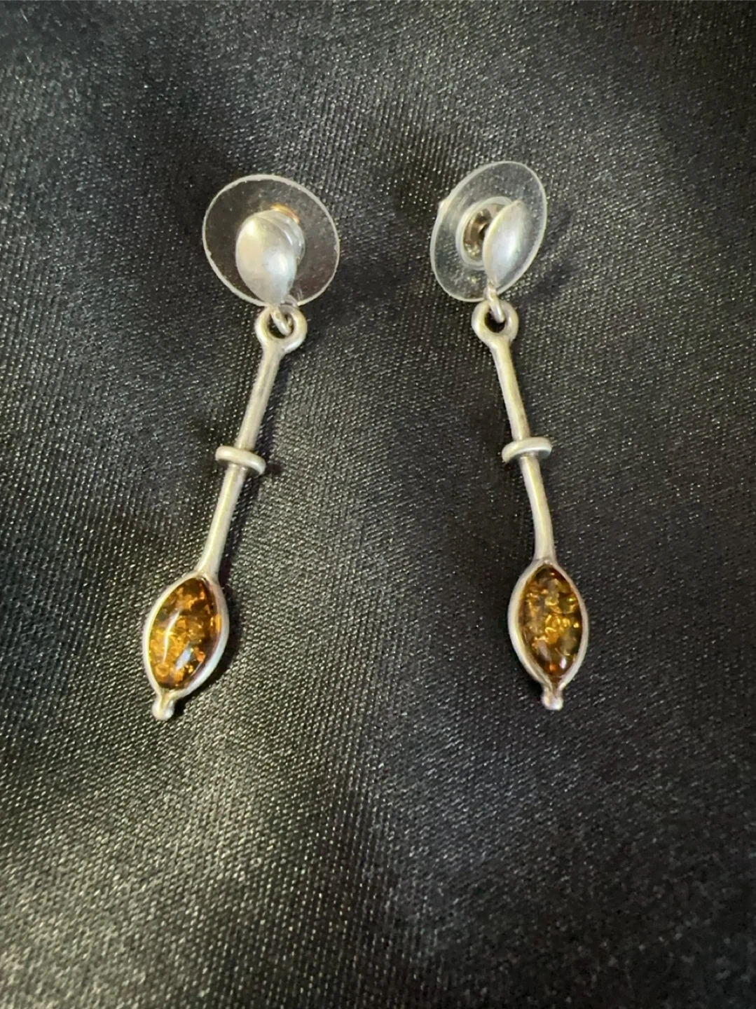 A pair of sterling silver dangle earrings with amber stones. The earrings have a unique elongated shape with a small silver accent. Includes clear plastic earring backs.