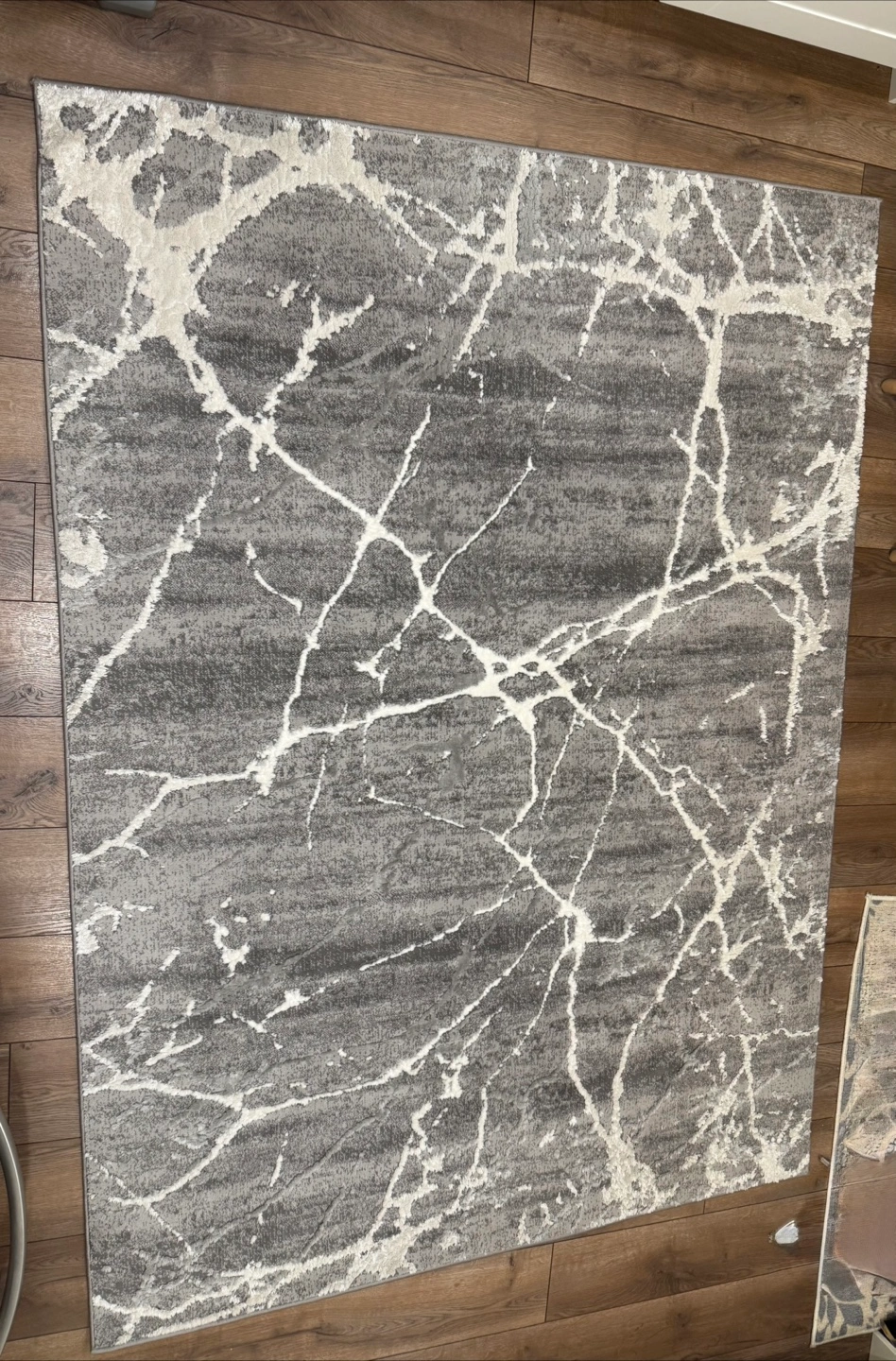 This is a stylish area rug with a grey marble-like pattern. It's a great accent piece for any room. The material is soft and durable. 63”x 84”, in excellent like new condition. $50, cash only please.