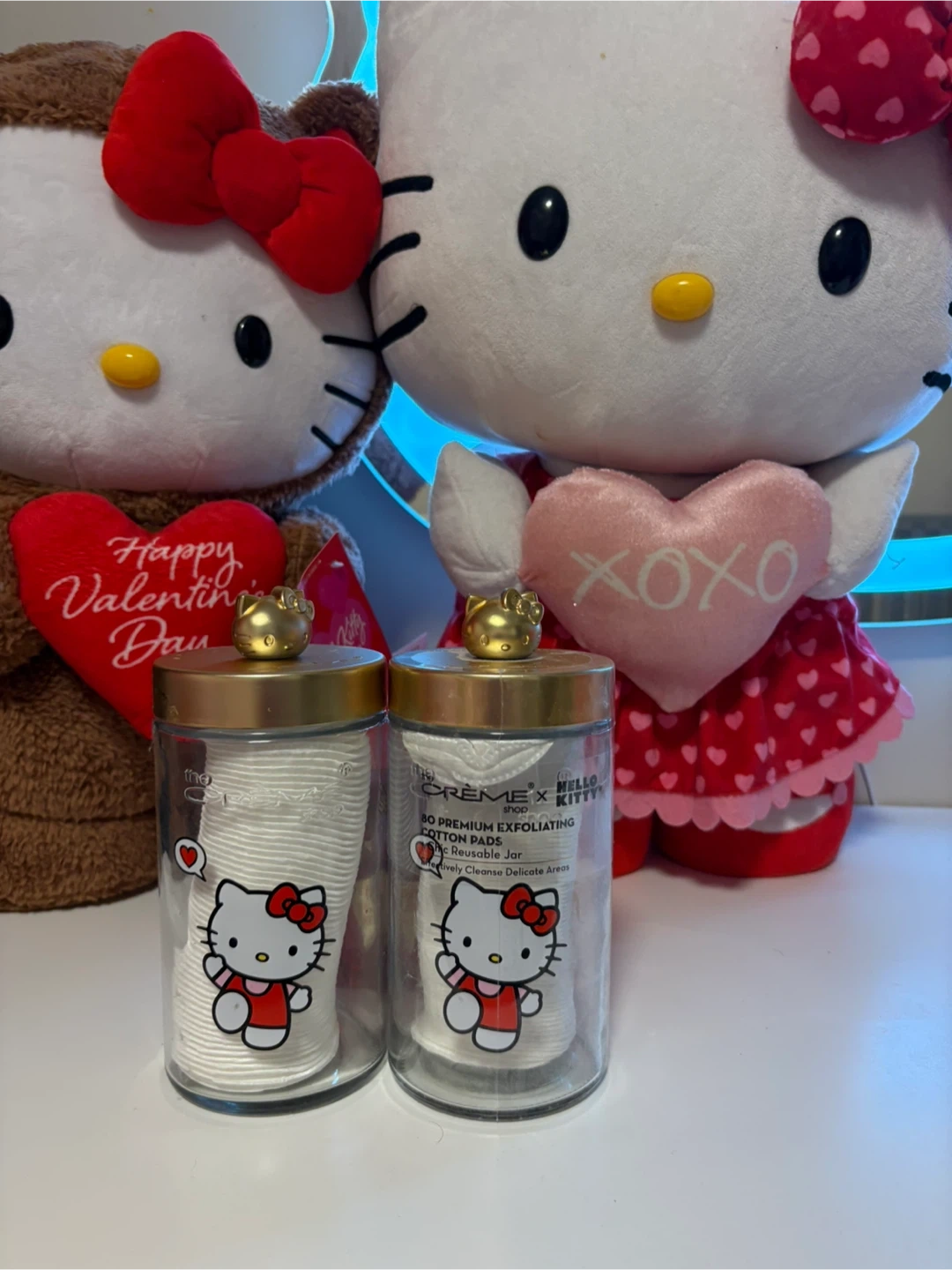 Crème Shop x Hello Kitty reusable jar filled with 80 premium exfoliating cotton pads. These pads are designed to effectively cleanse delicate areas. The jar features cute Hello Kitty graphics and a gold li