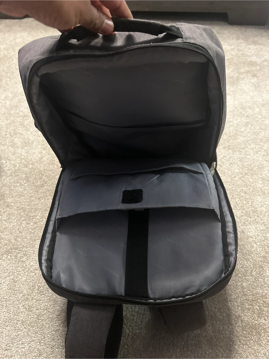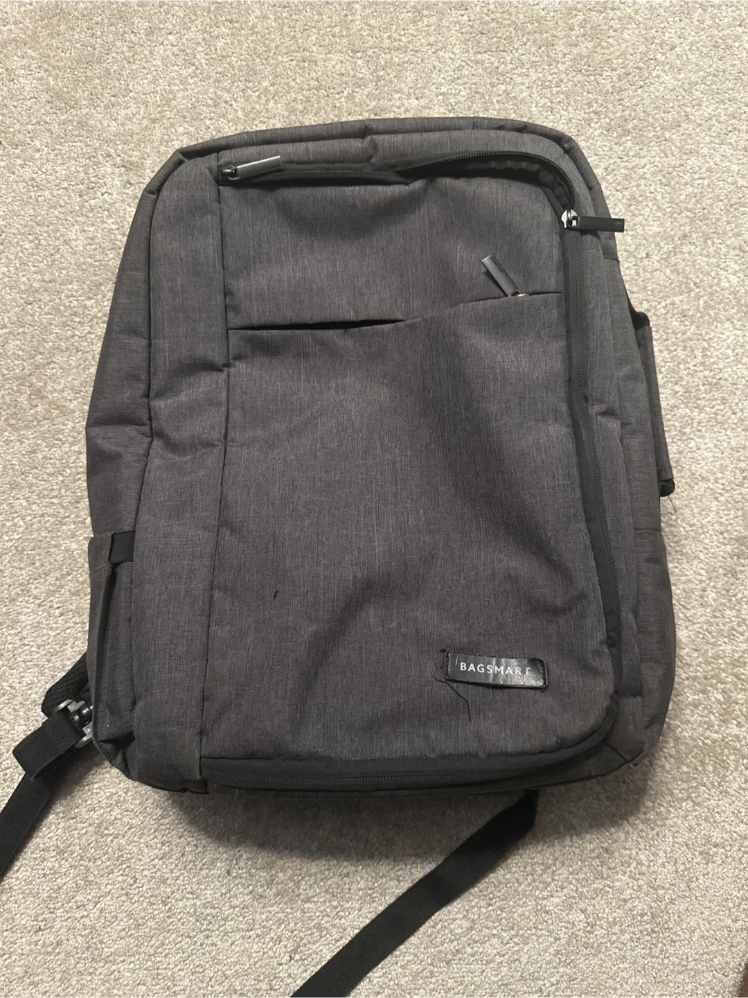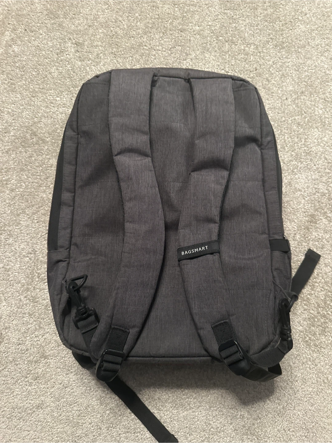 This is a BAGSMART backpack in a dark grey heathered fabric. It has multiple compartments and padded shoulder straps. It's suitable for carrying a laptop or daily essentials.