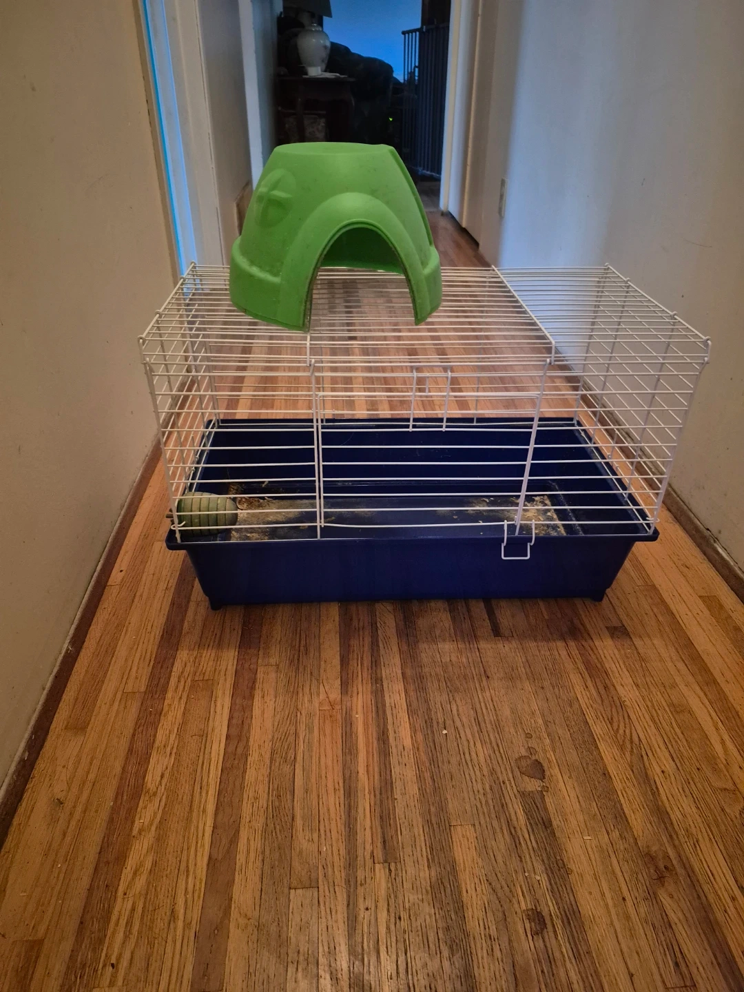 This is a blue plastic base small animal cage with a white wire top. It includes a green plastic hideout house. Cage is suitable for small pets like hamsters or gerbils.