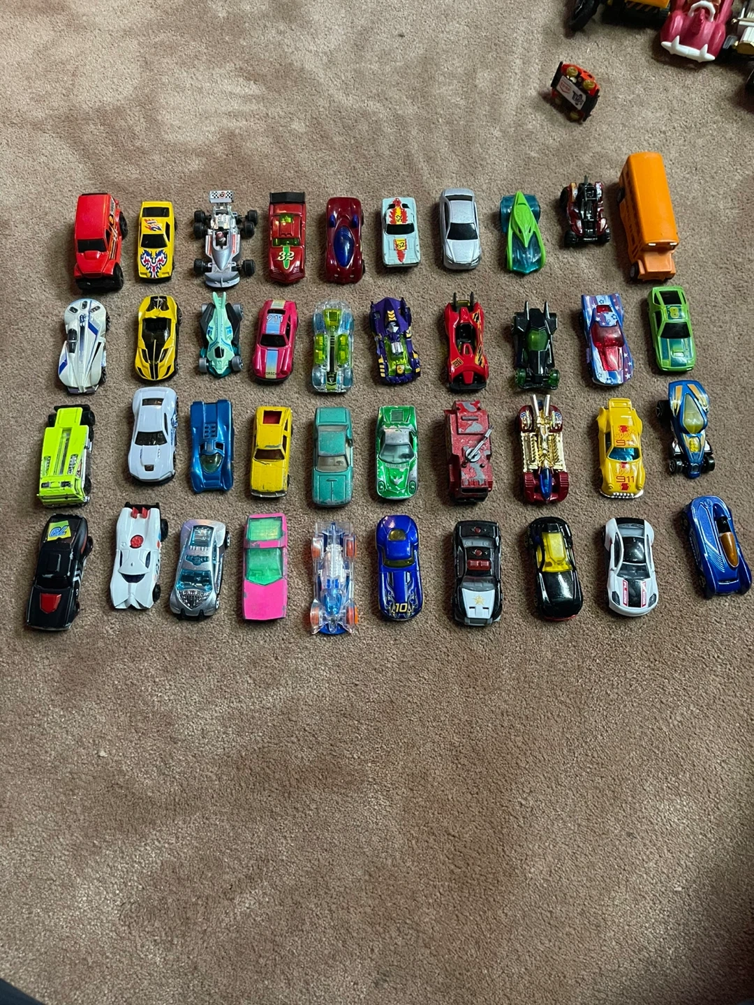 This is a collection of assorted toy cars, including Hot Wheels. They're made of die-cast metal and plastic. This lot is great for collectors or kids who love cars!