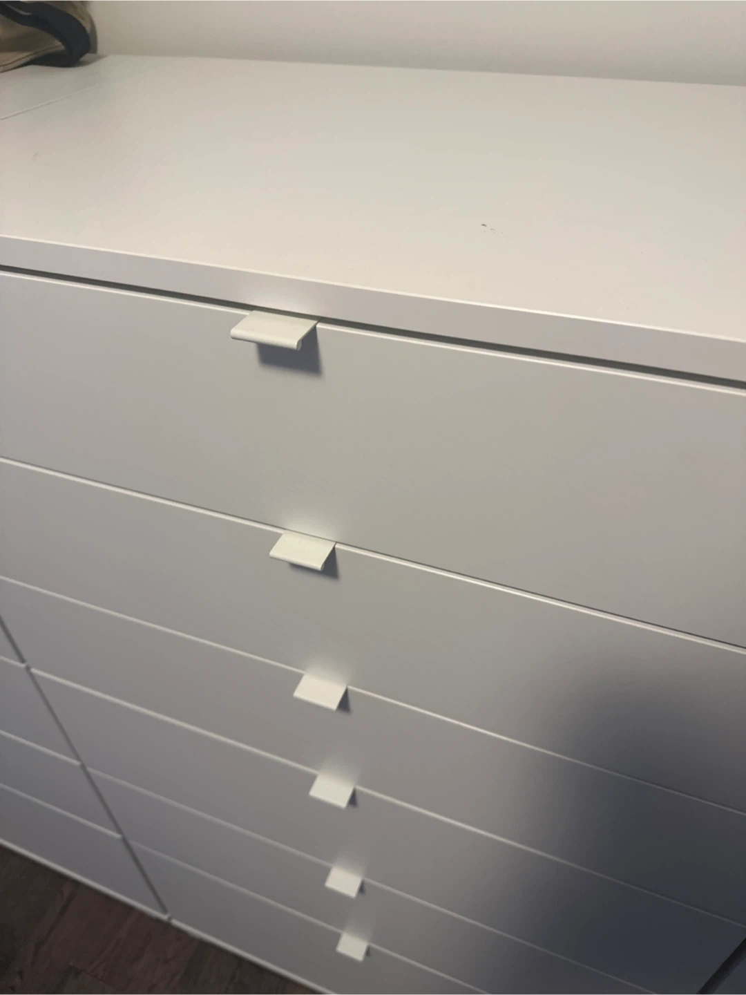 This is a white dresser with six drawers. It's great for storing clothes or other household items. The clean design fits well in most rooms.