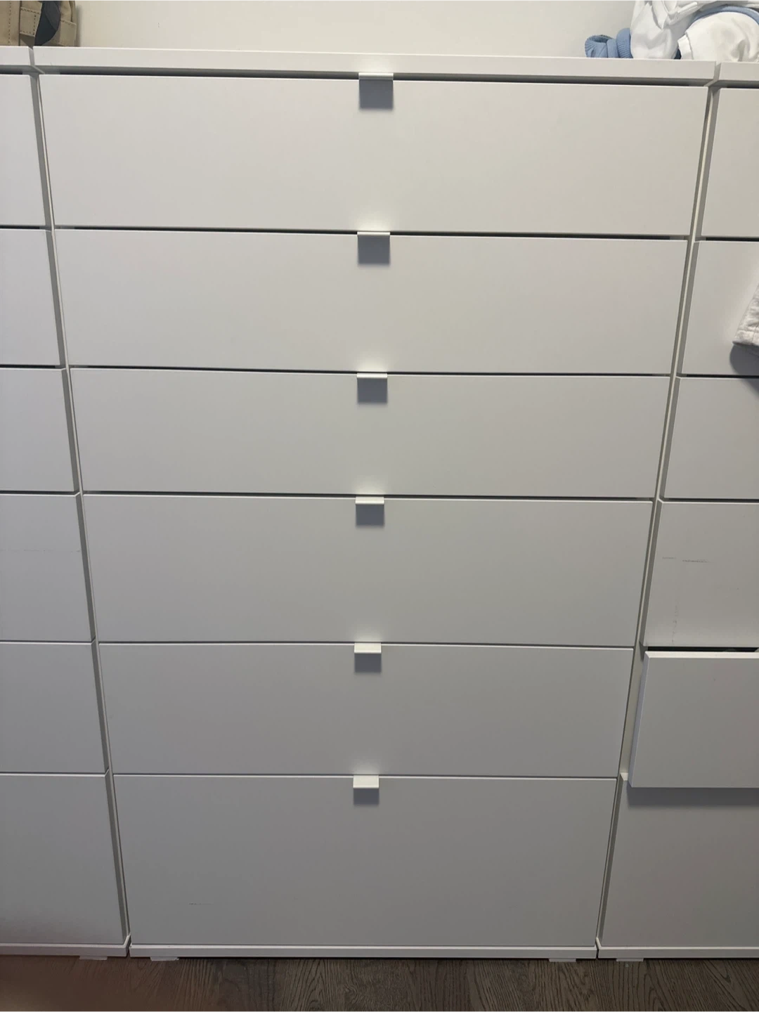This is a white dresser with six drawers. It's great for storing clothes or other household items. The clean design fits well in most rooms.