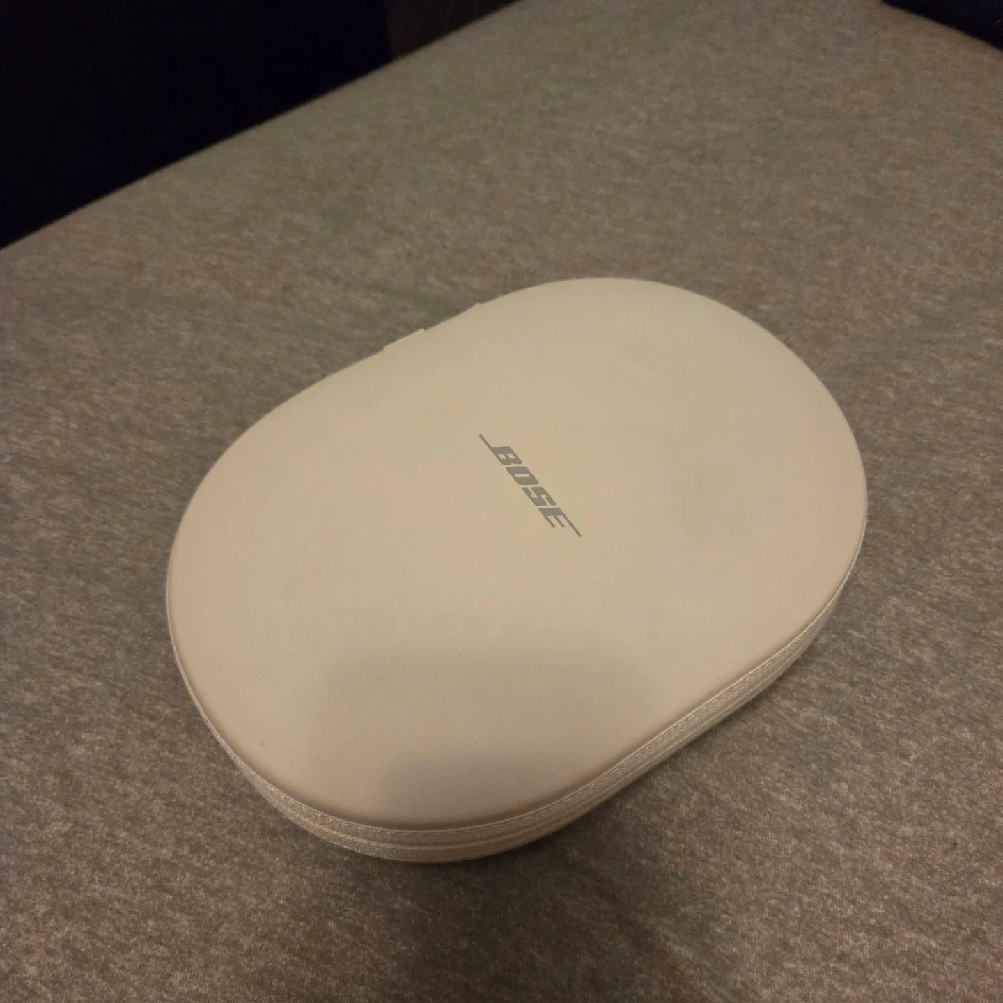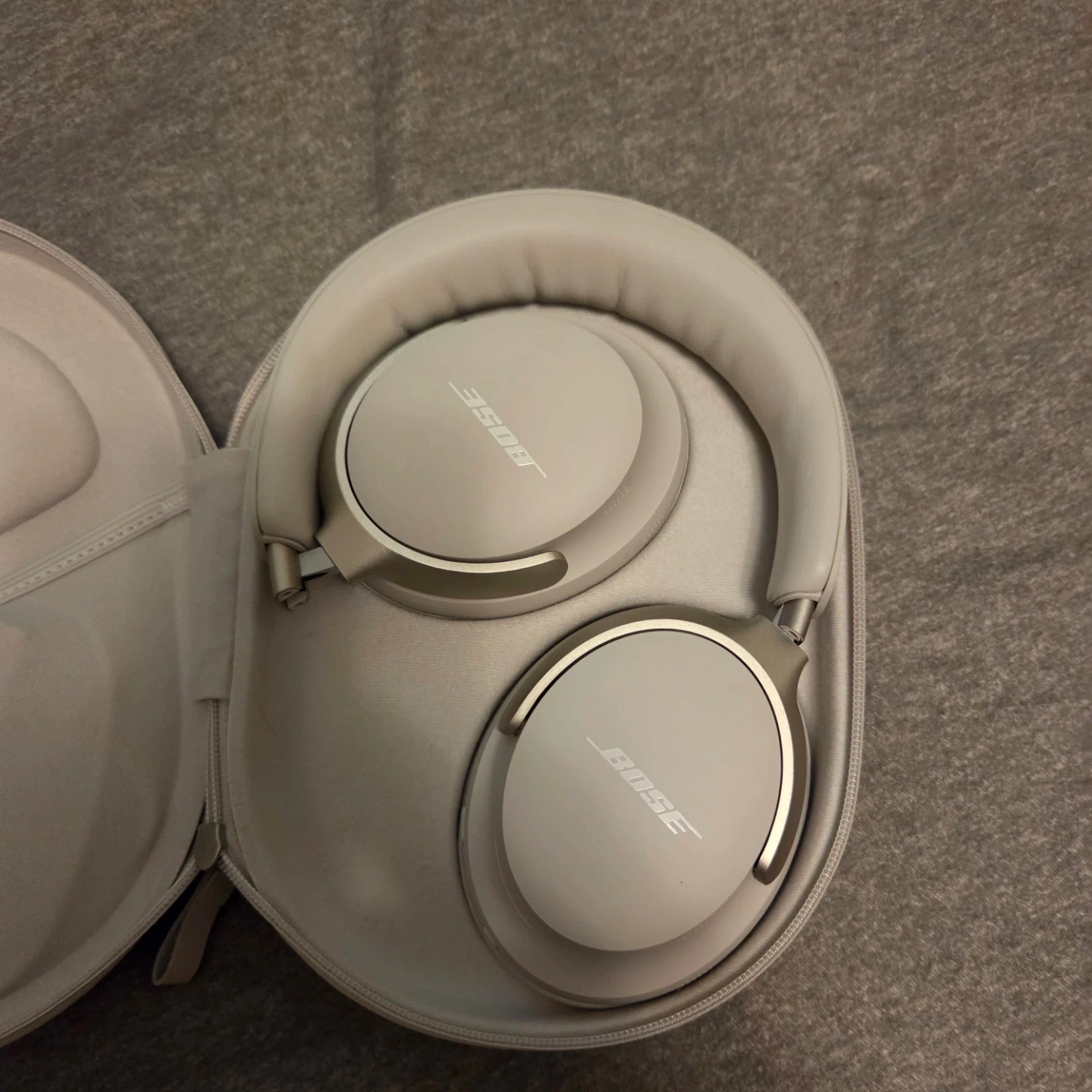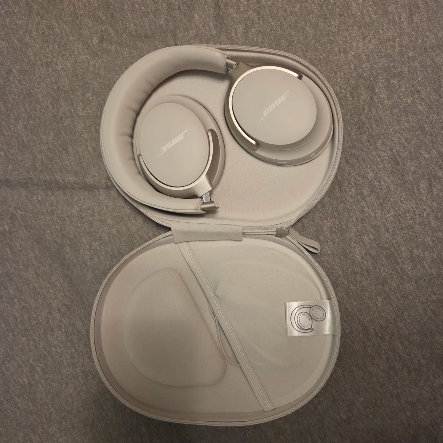 Bose noise cancelling headphones in a light beige colour. They come with their original protective case and all the accessories. These headphones offer a great audio experience.
