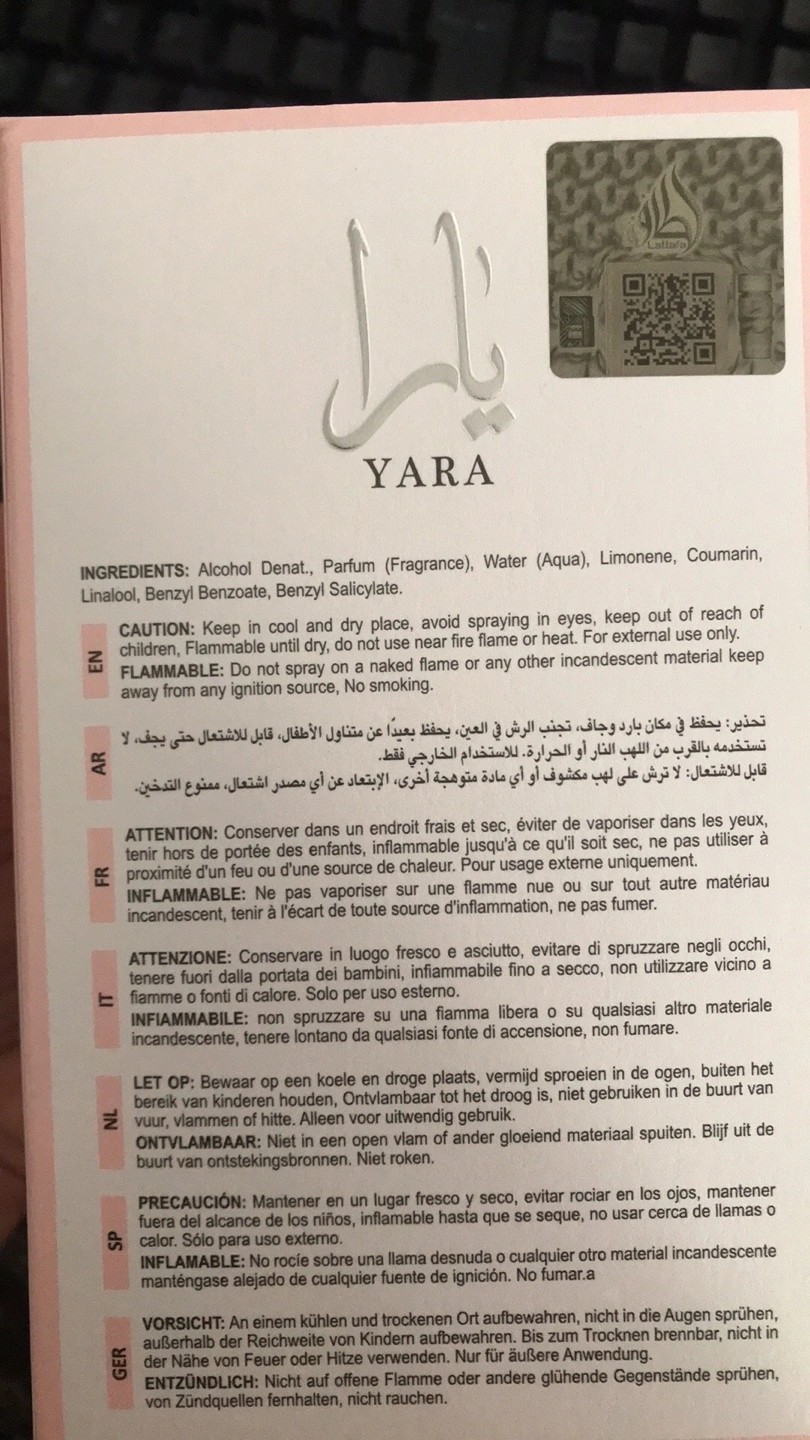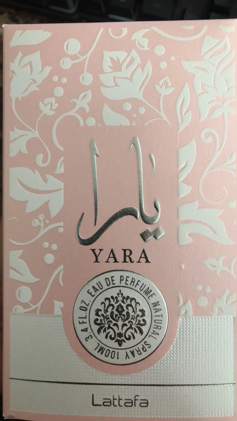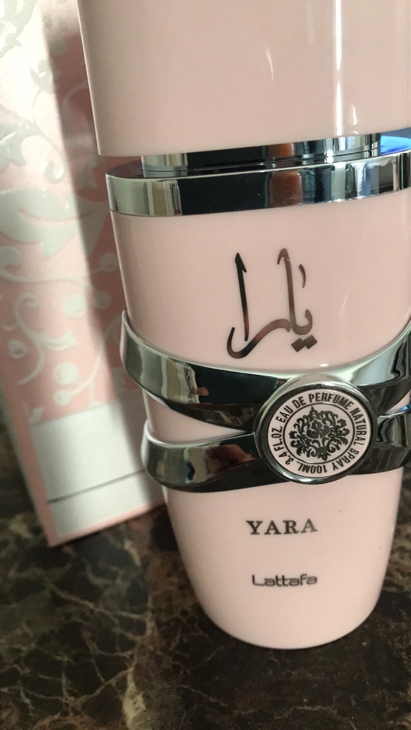 This is the Lattafa Yara Eau de Parfum Natural Spray. It contains 100ml of product. Bottle features a light pink design with silver accents. Alcohol, Benzoin, Coumarin, Linalool, Benzyl Salicylate included in ingredients.
