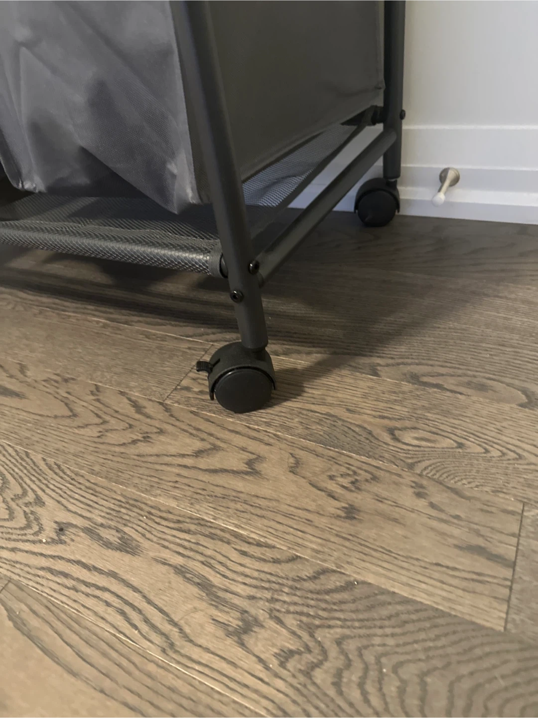 This grey laundry sorter features three separate bins for organizing your clothes. It's constructed with a metal frame and fabric bags. It rolls easily on wheels, making laundry day a breeze!