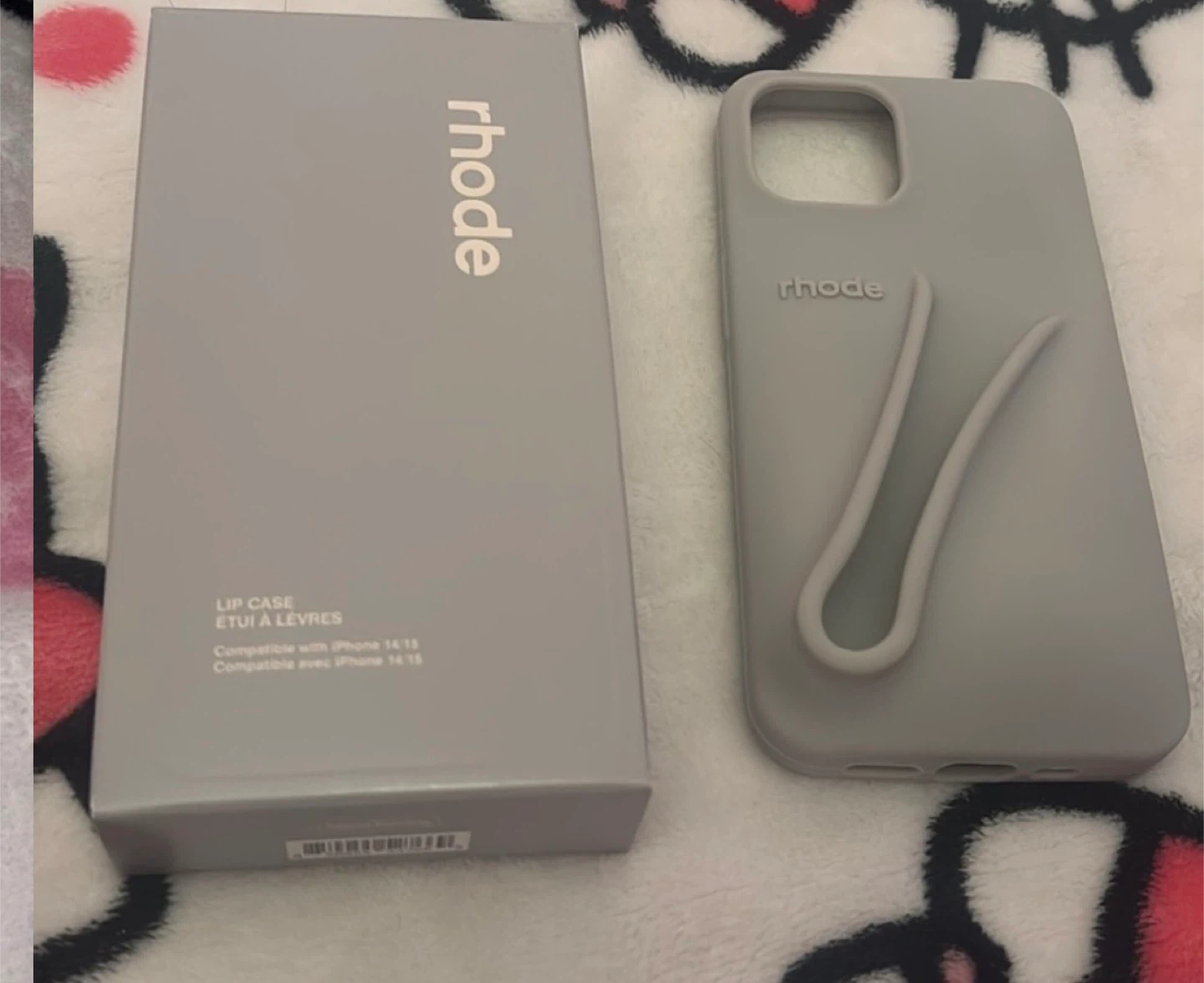 This is a Rhode Lip Case designed for iPhone 14 and 15 models. It's made from a flexible material and includes a convenient strap for carrying. The case is grey and comes with its original packaging.