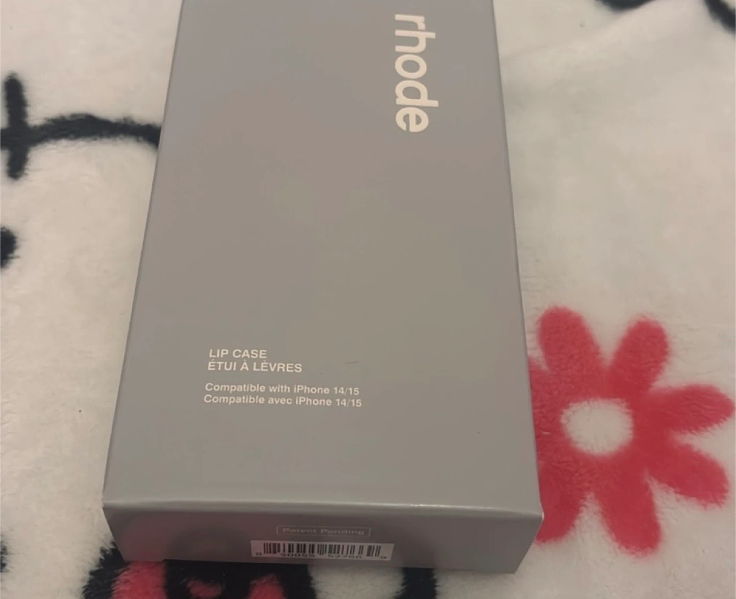 This is a Rhode Lip Case designed for iPhone 14 and 15 models. It's made from a flexible material and includes a convenient strap for carrying. The case is grey and comes with its original packaging.