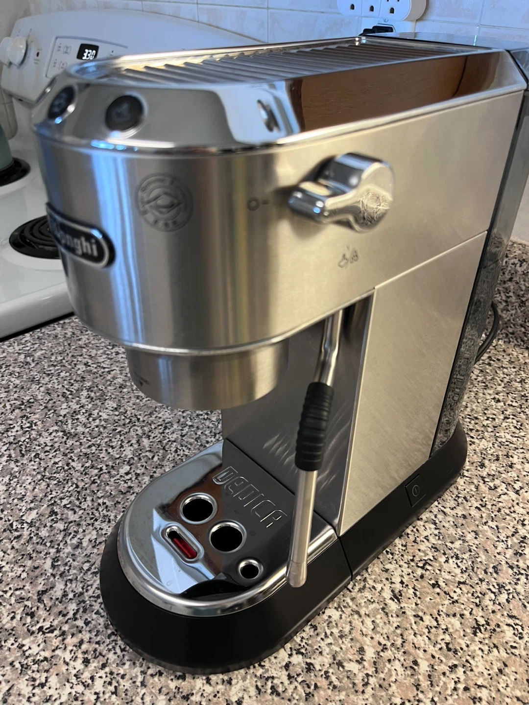 This DeLonghi Dedica Arte machine brews top quality espresso and cappuccinos. It includes the portafilter with filter baskets for single and double shots. It's a compact coffee maker that's great for small kitchens. Instruction manual and original box are included. Only used for 1 year.