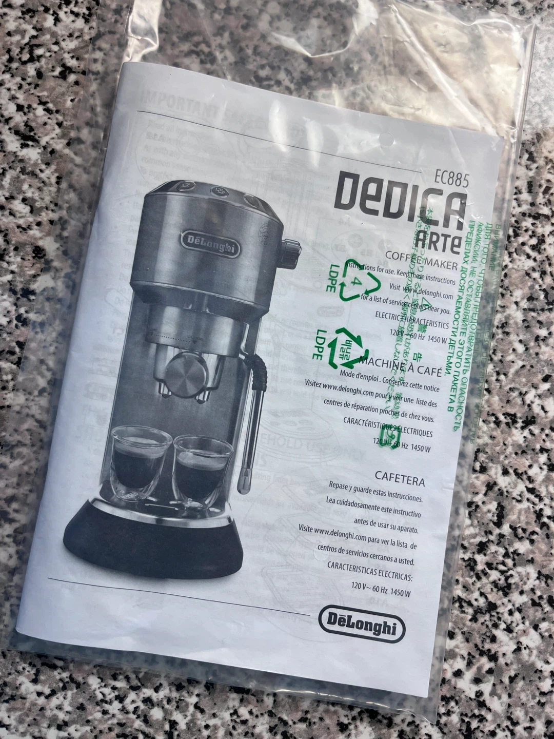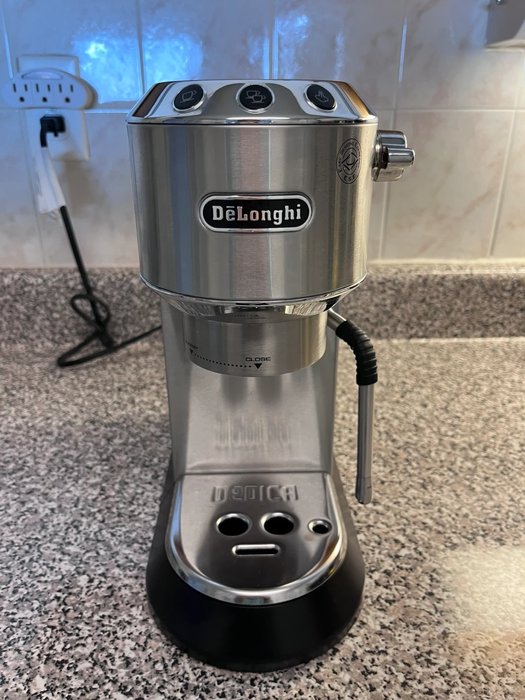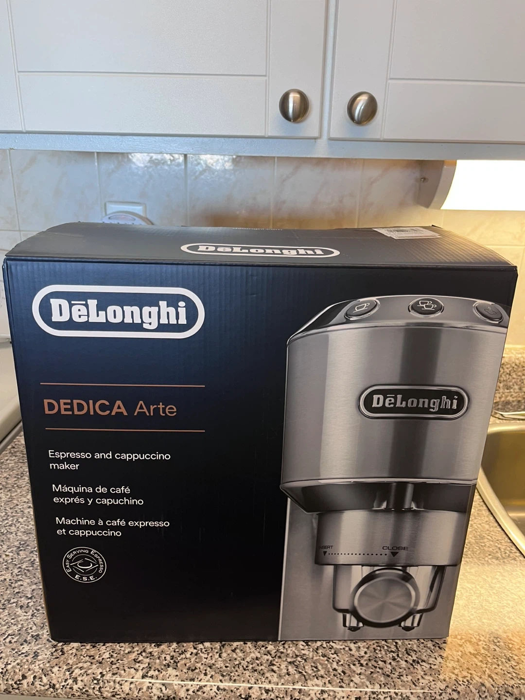 This DeLonghi Dedica Arte machine brews top quality espresso and cappuccinos. It includes the portafilter with filter baskets for single and double shots. It's a compact coffee maker that's great for small kitchens. Instruction manual and original box are included. Only used for 1 year.