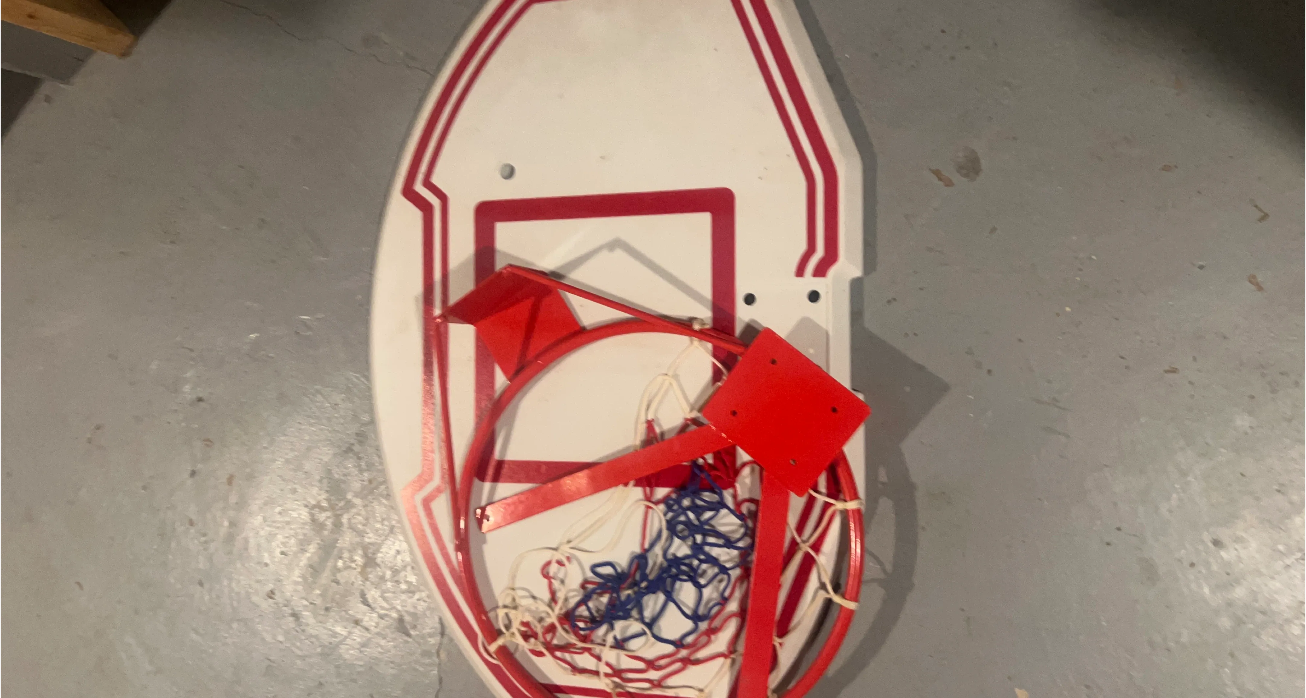 White backboard with red trim and a red hoop with a mixed red, white, and blue net. This set is great for indoor or outdoor play. It's ready for some hoop dreams!
