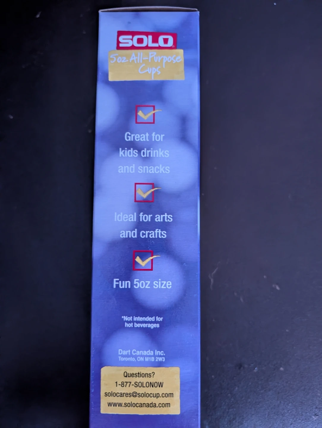 This box contains 100 SOLO 5oz paper cups. They're leak-resistant with fun and coordinating designs. Great for kids' drinks, snacks, or arts and crafts!