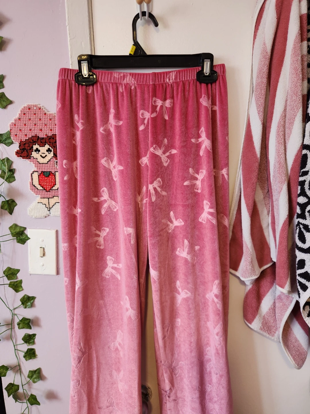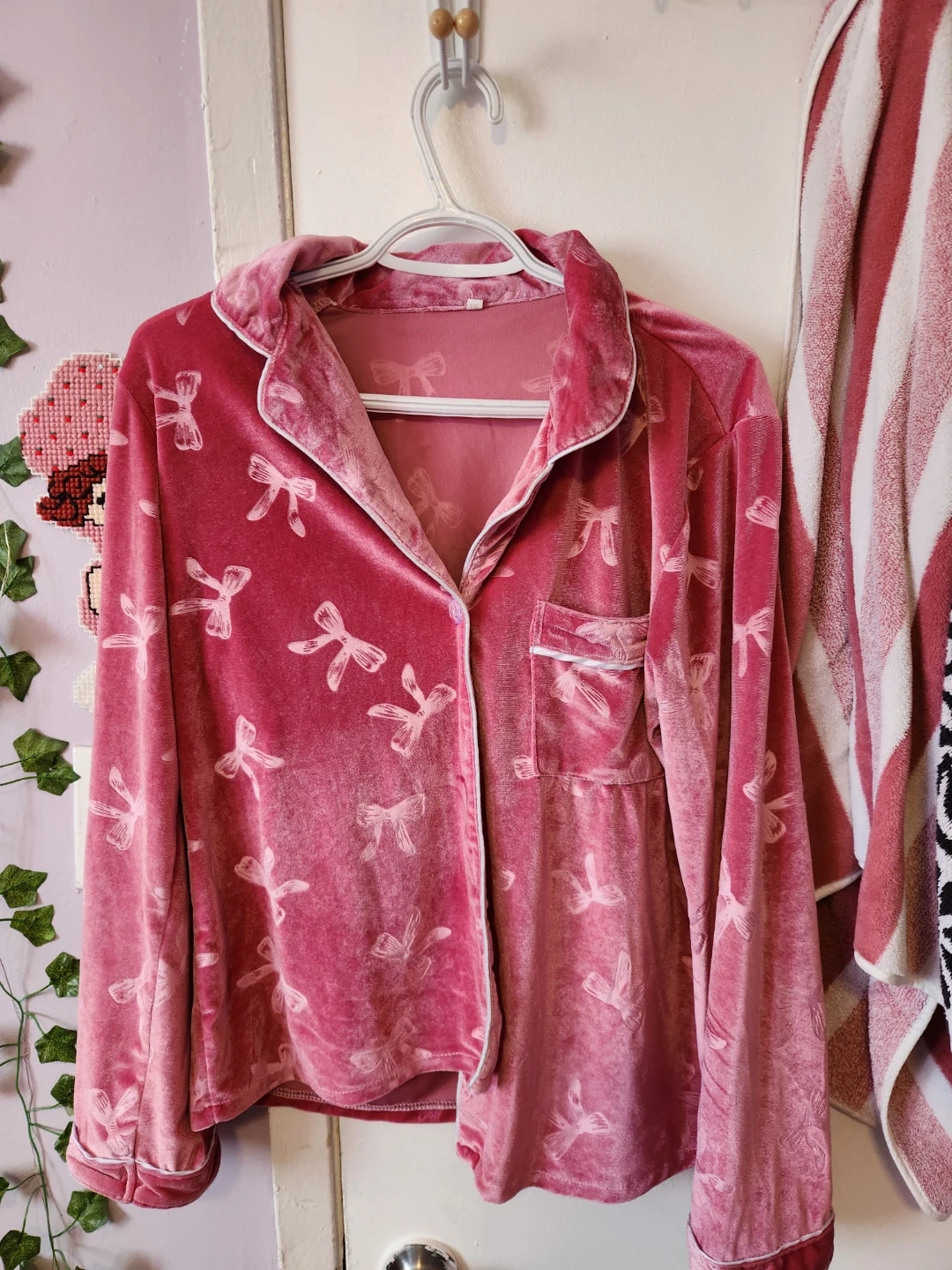 Soft pink velvet pajama set featuring a playful bow pattern. It's a long-sleeved button-up top and matching elastic-waist pants. This set feels super cozy!