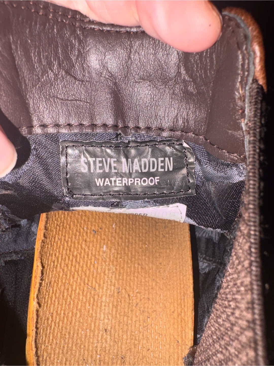 These are Steve Madden waterproof brown leather Chelsea boots. They're made with genuine leather and feature elastic side panels for an easy slip-on style. Great for rainy days!