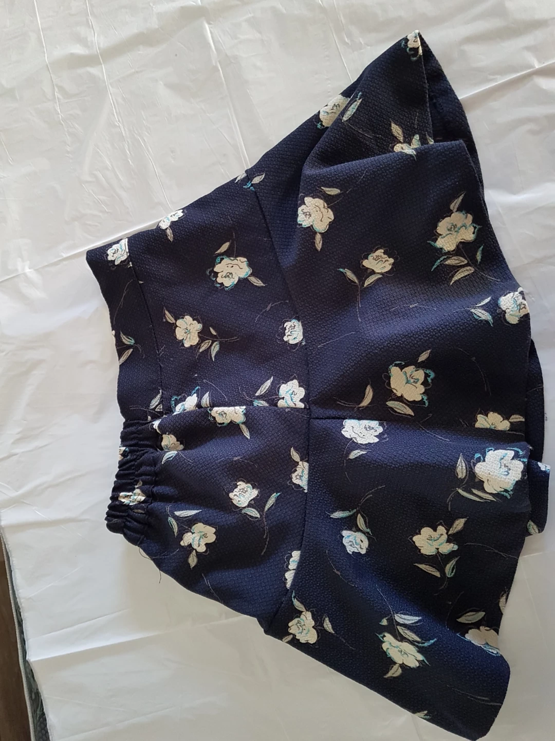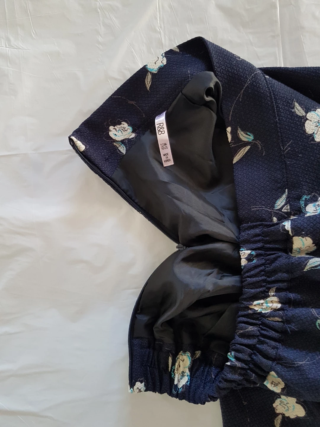This navy blue R&B skirt features a white floral print and a comfortable elastic waistband. It's made in Korea with a smooth black lining. Perfect for adding a touch of pattern to your outfit!