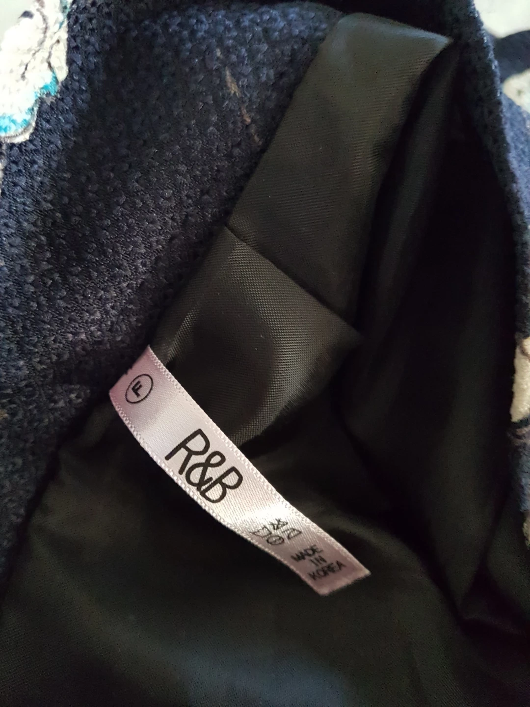 This navy blue R&B skirt features a white floral print and a comfortable elastic waistband. It's made in Korea with a smooth black lining. Perfect for adding a touch of pattern to your outfit!