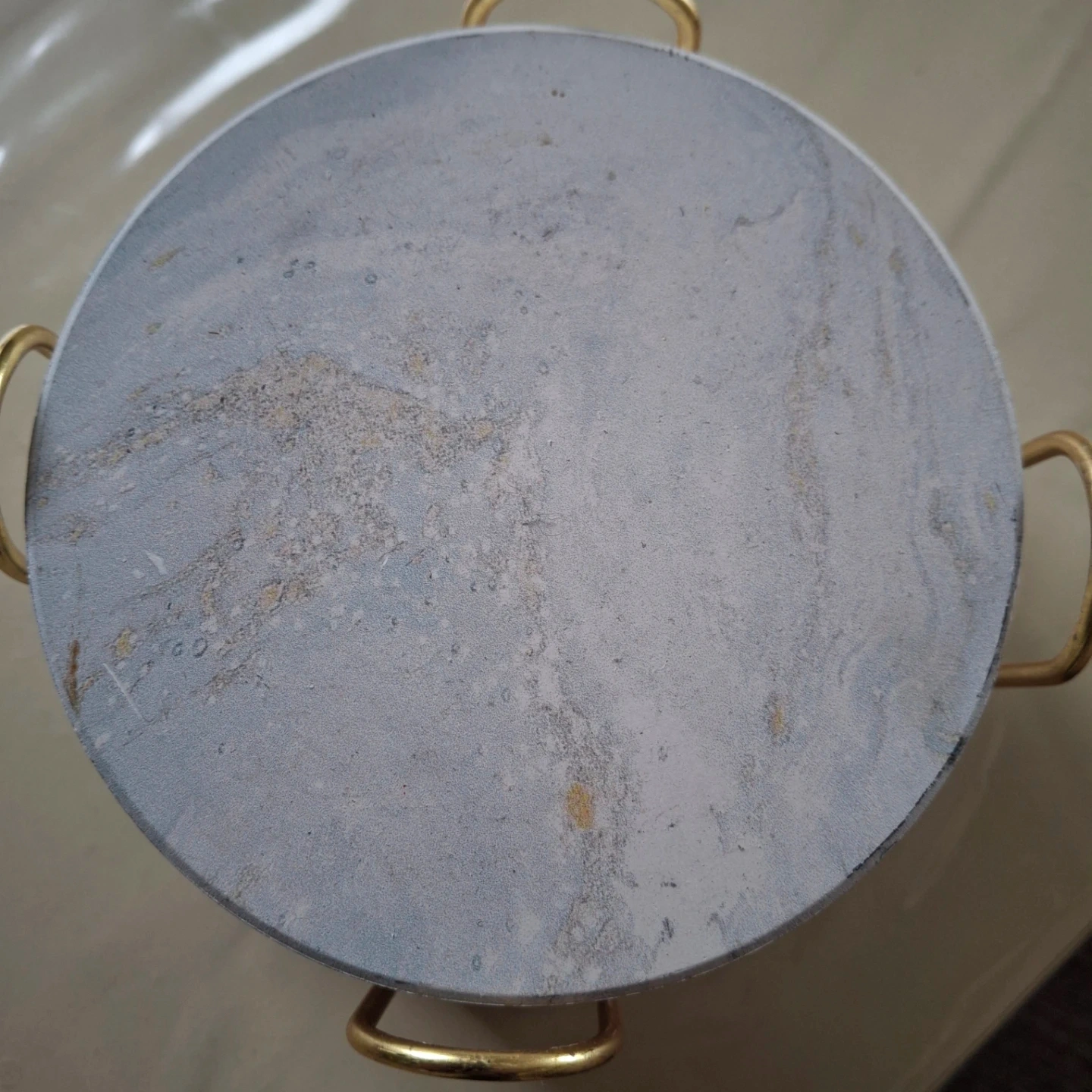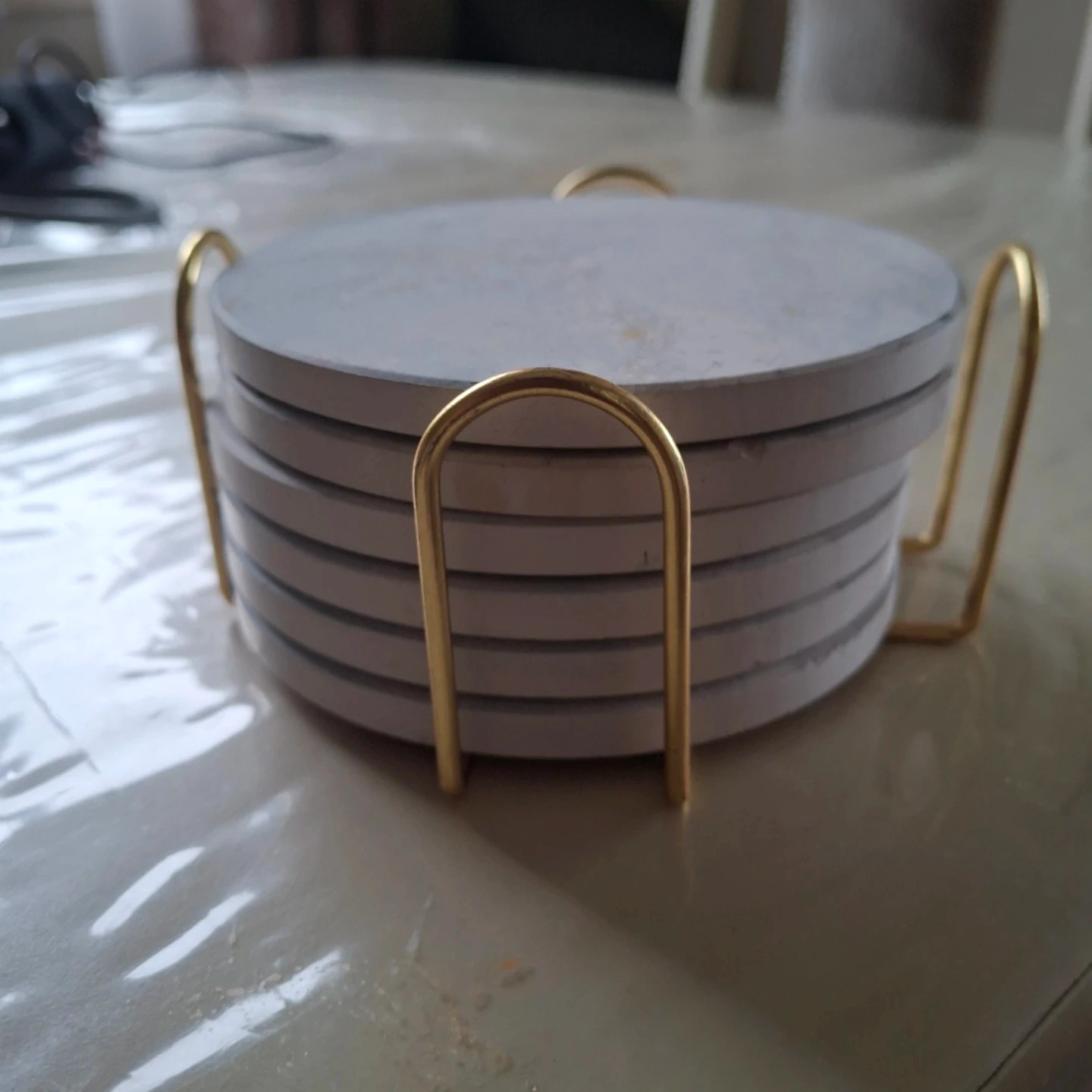 This set includes six stone coasters, each with a unique marbled pattern. They come with a stylish gold metal holder. Coasters are approximately 3.5 inches in diameter.