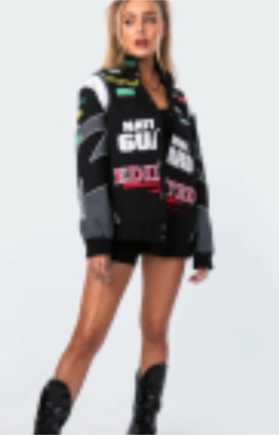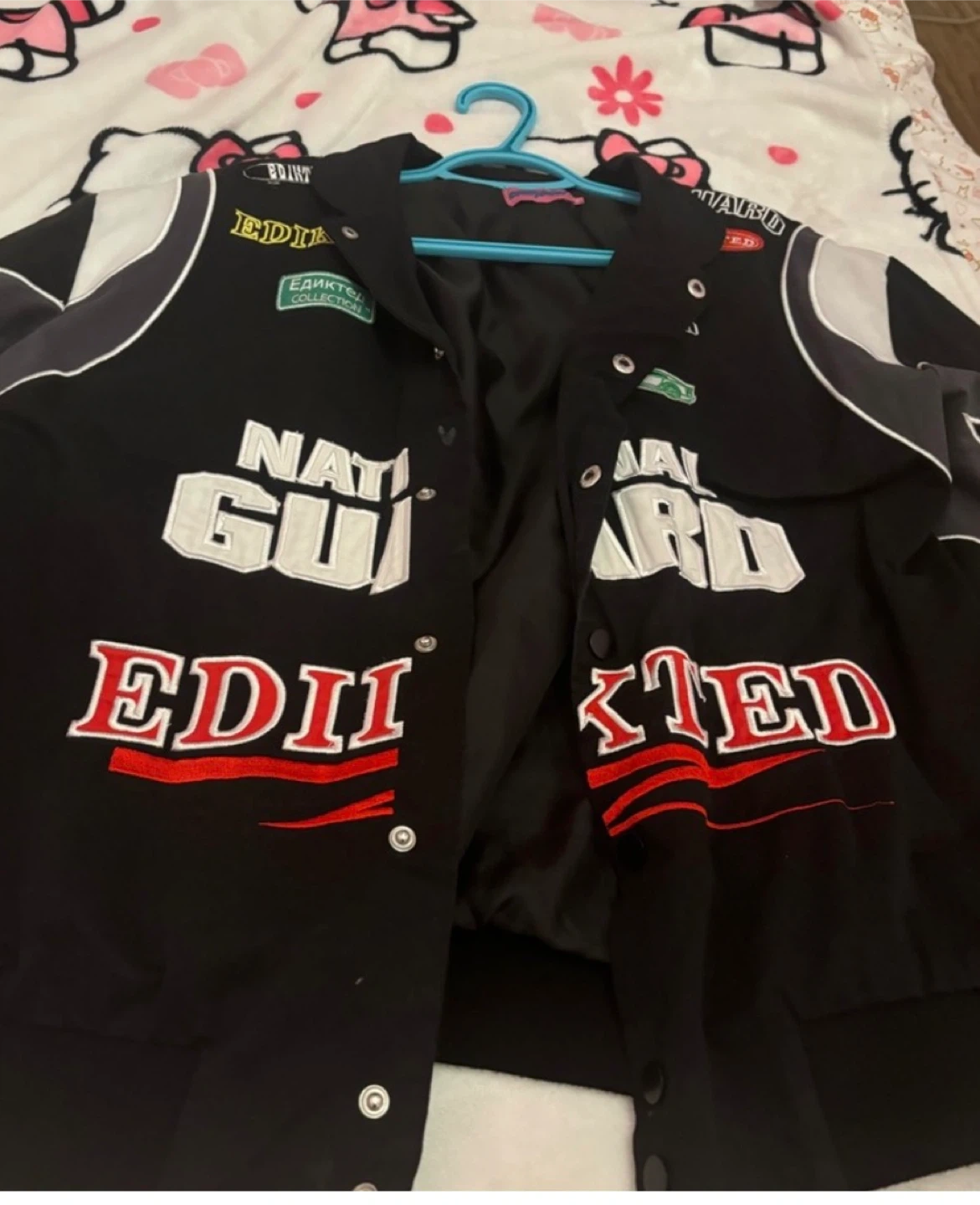 This is a black bomber jacket featuring "National Guard" embroidery on the front and sleeves. It's designed with a classic snap-button closure and ribbed cuffs. The jacket's lining is smooth black fabric.