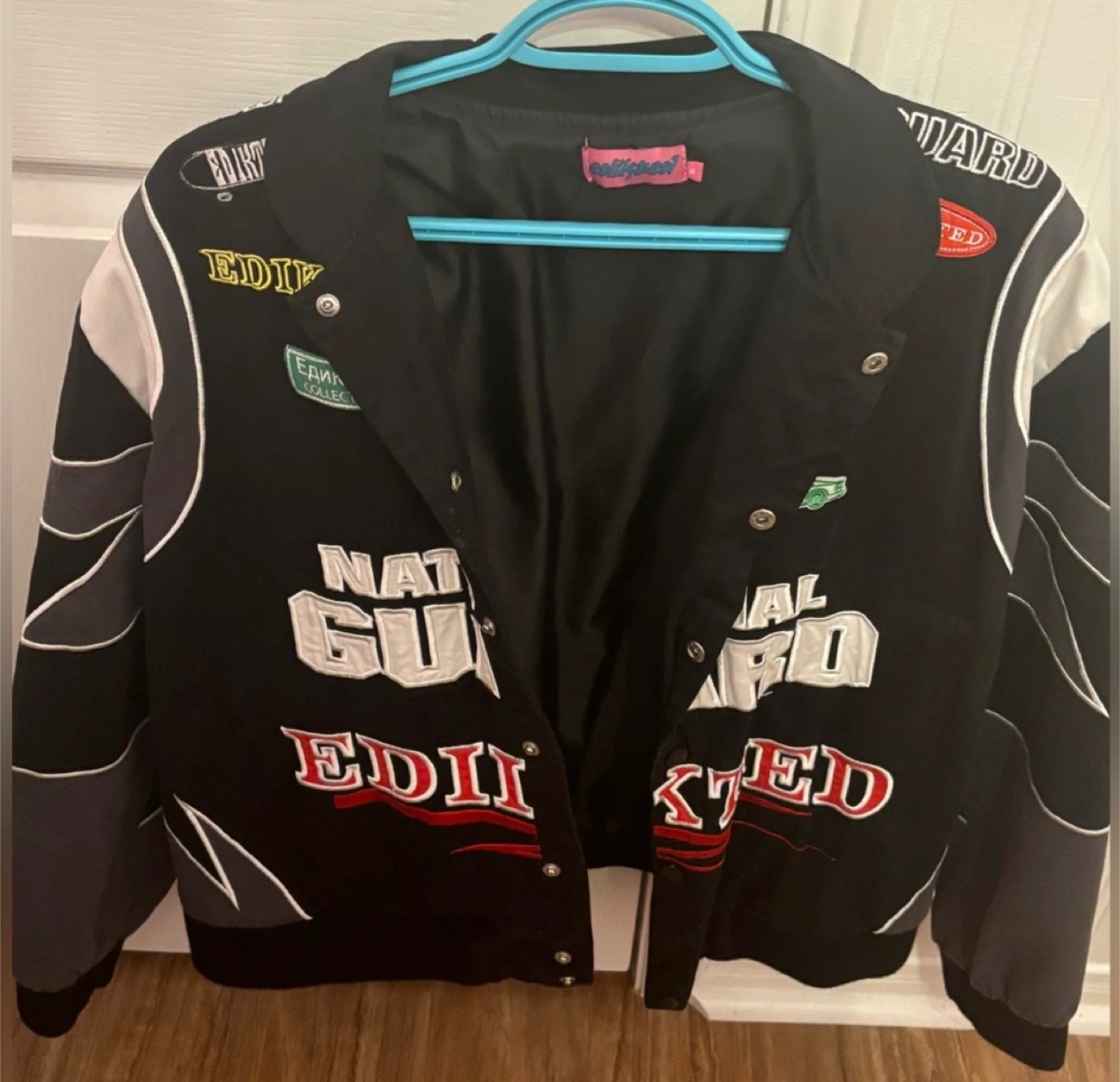 This is a black bomber jacket featuring "National Guard" embroidery on the front and sleeves. It's designed with a classic snap-button closure and ribbed cuffs. The jacket's lining is smooth black fabric.