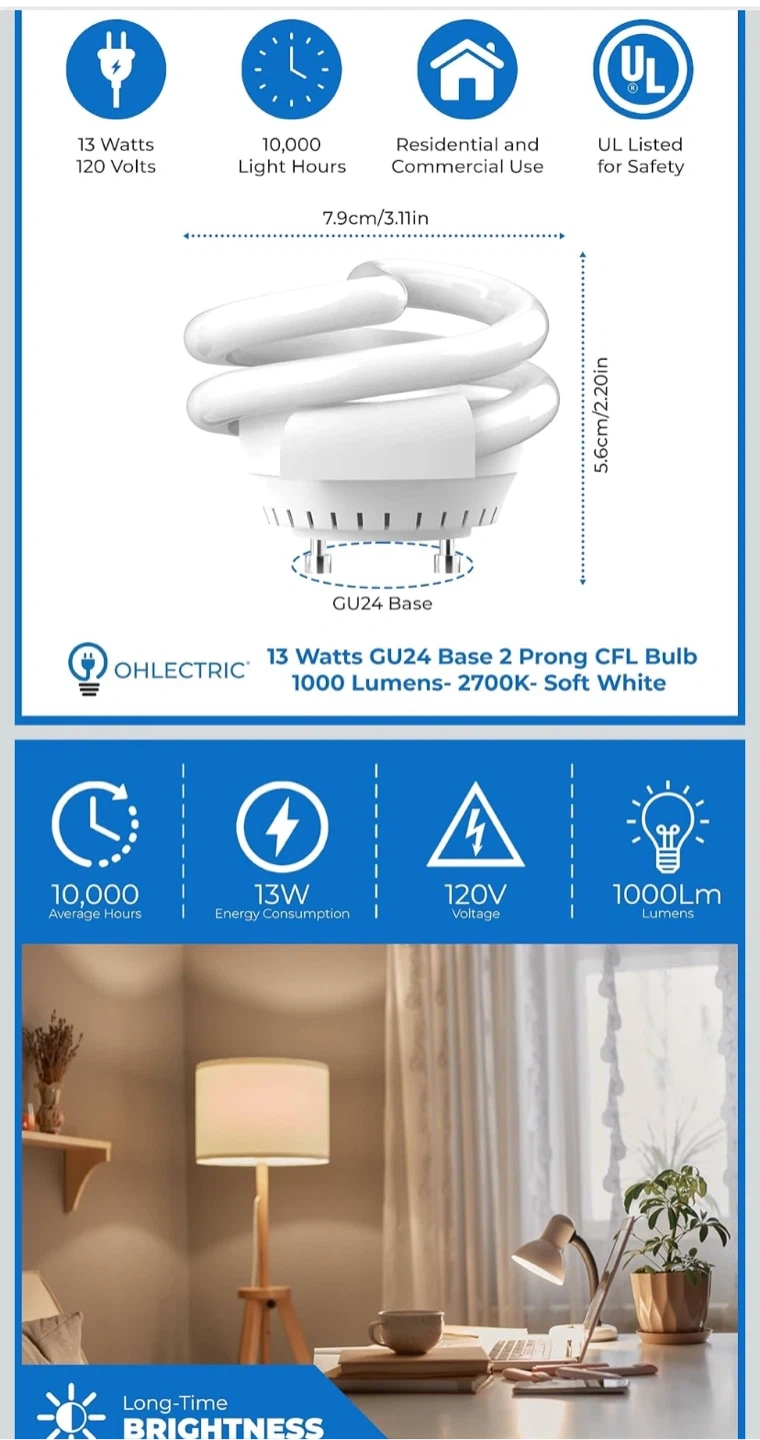 This is a 13 Watt CFL light bulb with a GU24 base. It's designed for 120V and provides 1000 lumens of light with a 2700K soft white colour temperature. It's rated for 10,000 average life hours.