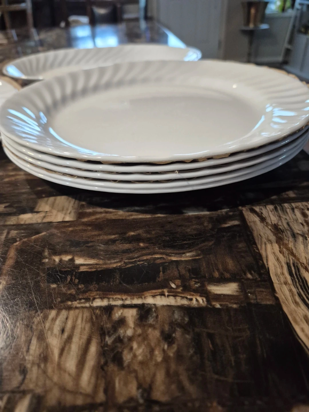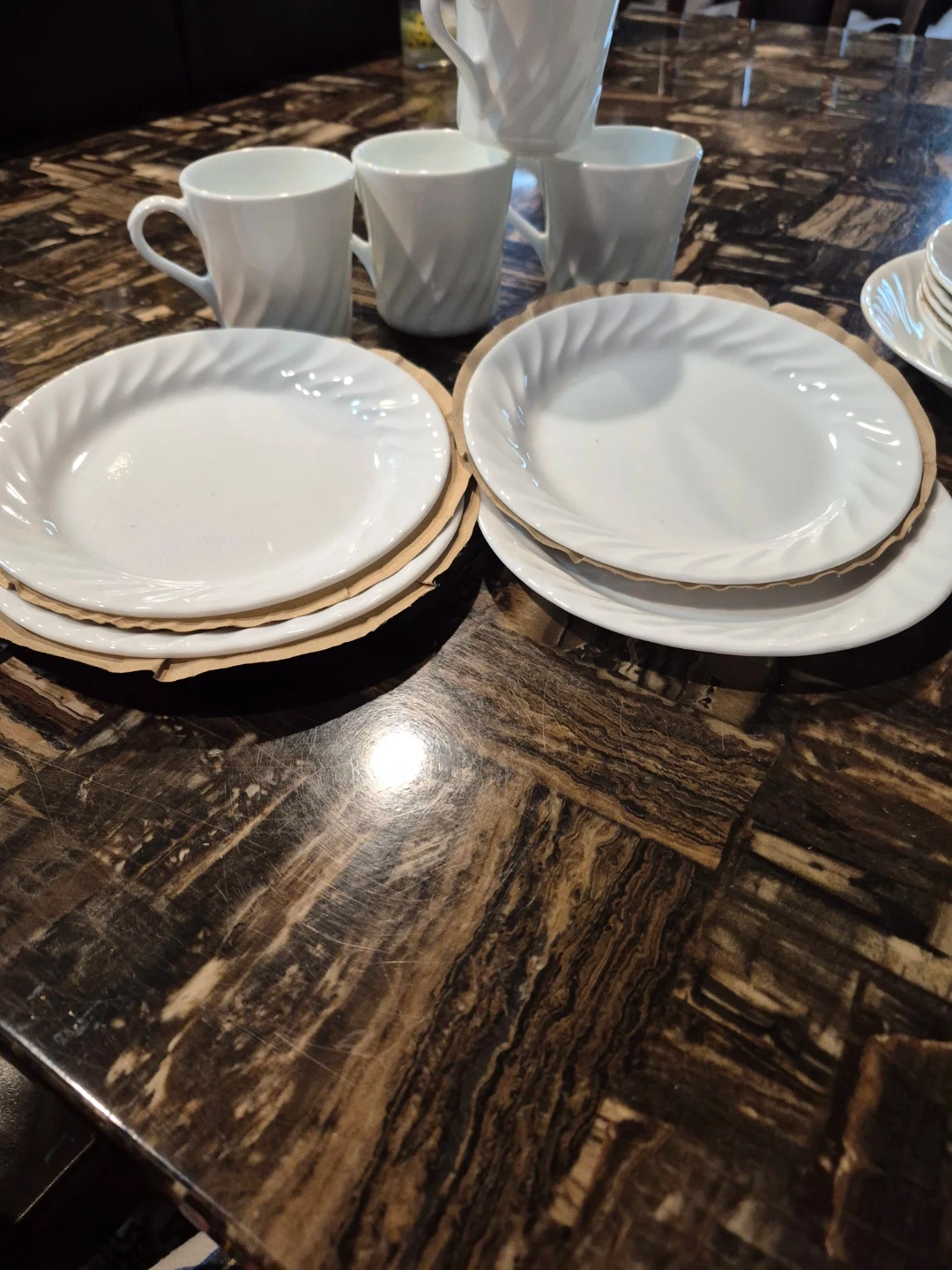 Corelle dish set that includes 5 dinner plates, 4 salad plates, 4 cups and one serving plate in excellent conditios. Total 14 pieces. Some plates are never used.