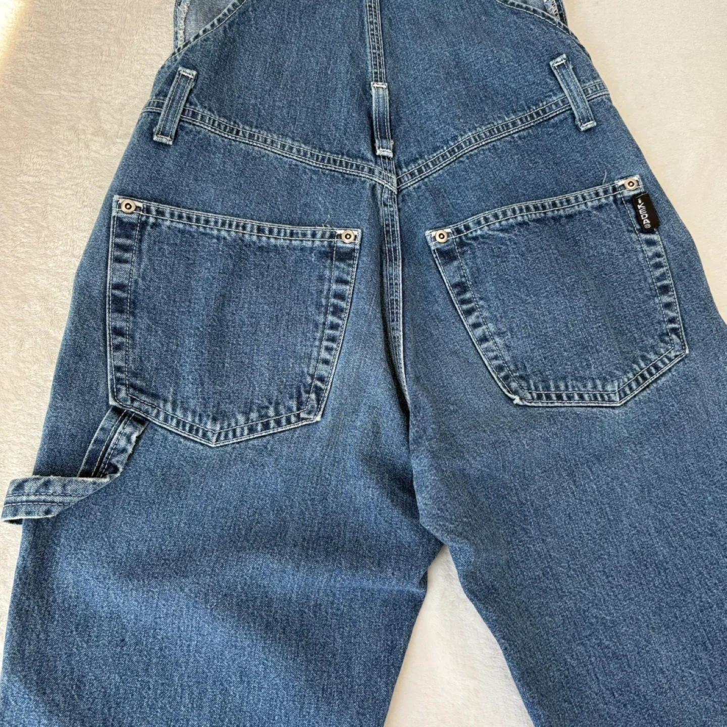 These authentic vintage Ikeda overalls offer the perfect Y2K utilitarian aesthetic. Crafted from durable 100% cotton denim, they feature a flattering wide bootcut leg, a functional carpenter loop, and multiple utility pockets for a true workwear-inspired look.
