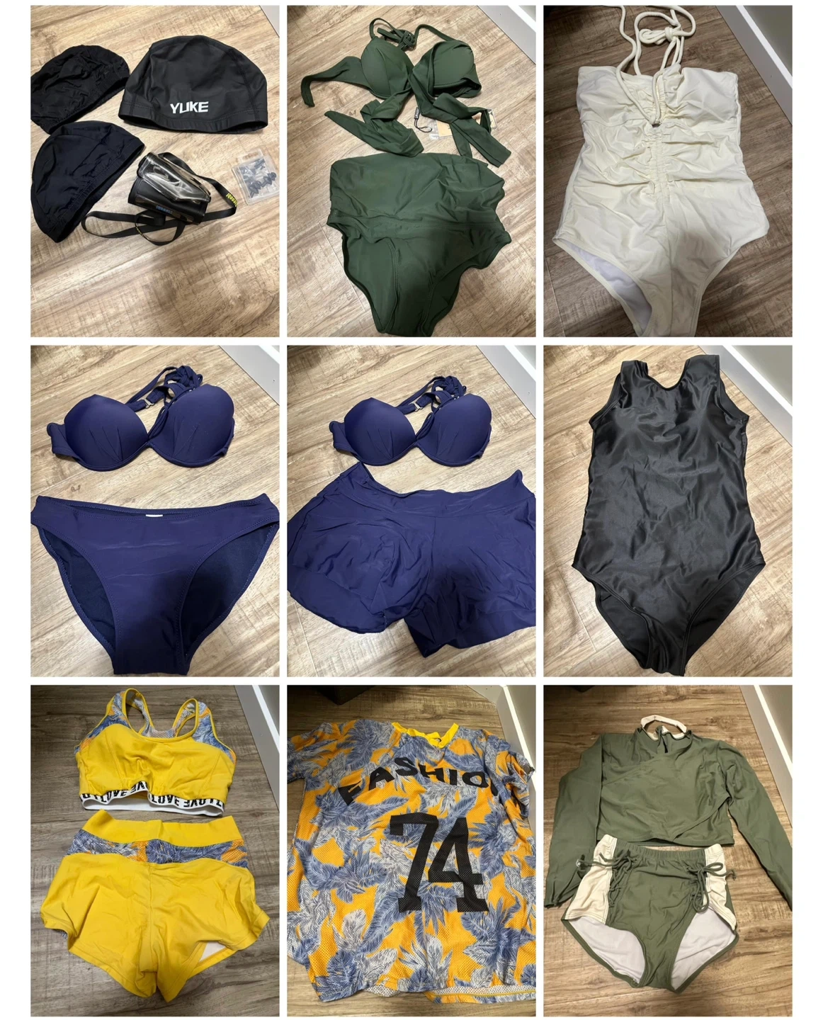 A variety of swimwear pieces. You'll get three black swim caps, one pair of goggles with earplugs, a dark green bikini set, an ivory one-piece swimsuit, a navy blue bikini with shorts, and a black tankini top. Also included is a yellow and blue athletic set and a patterned short-sleeve shirt. Perfect for your next beach vacation!