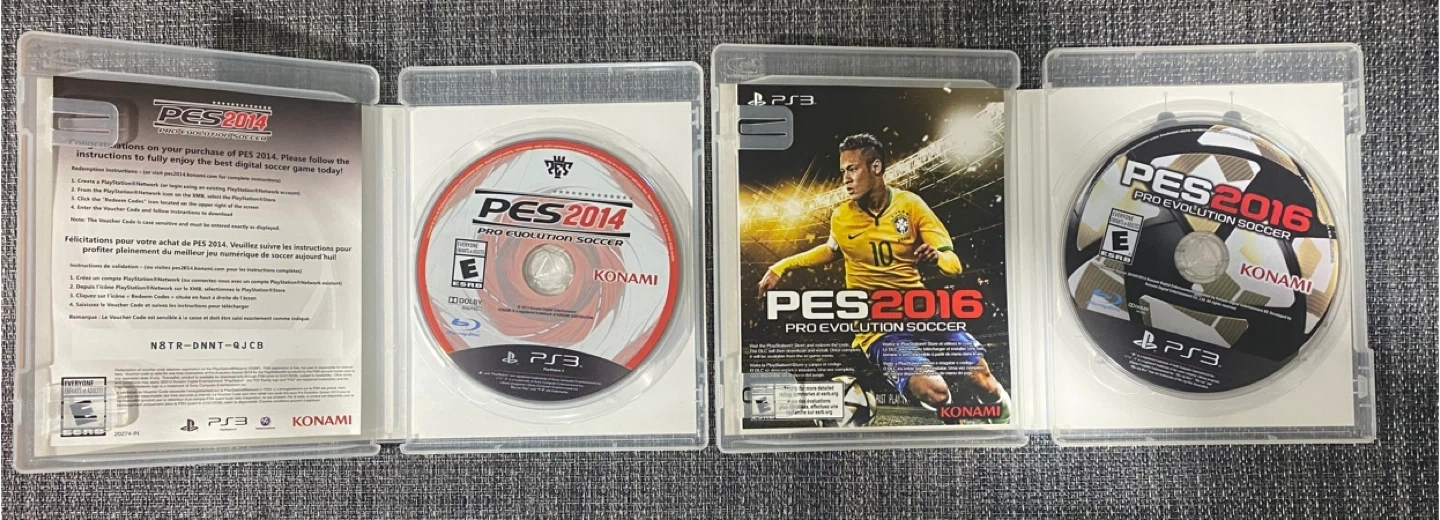 Selling two Pro Evolution Soccer (PES) games for PlayStation 3. This bundle includes PES 2014 and PES 2016. Perfect for soccer game enthusiasts looking to add to their collection. Each one is 30 or take them both for 50