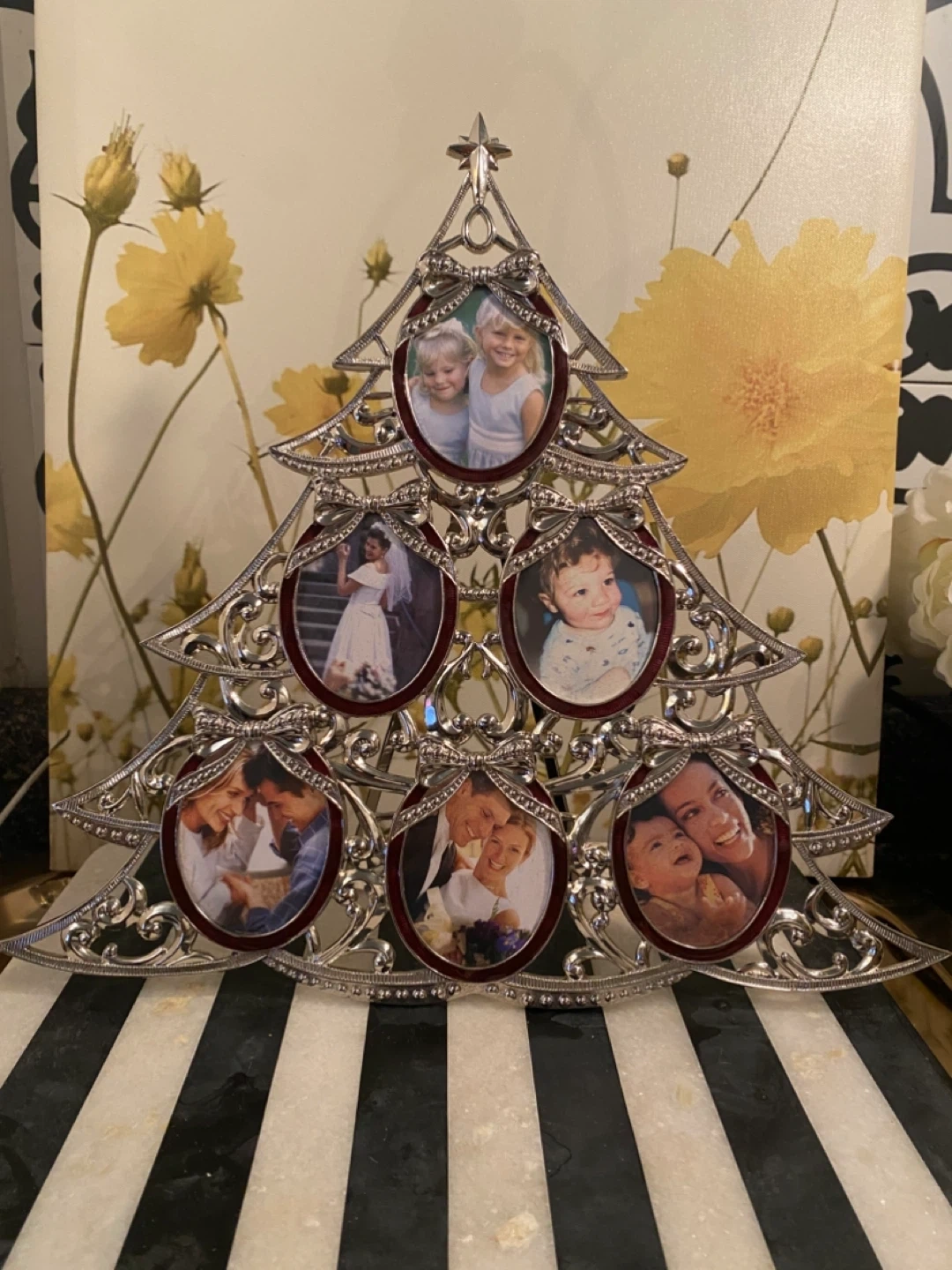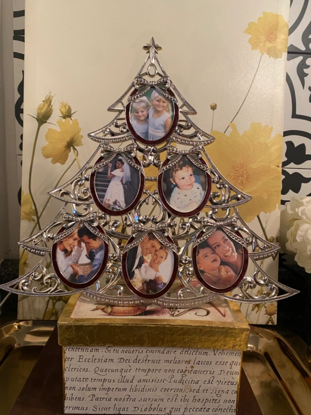 This festive photo frame is shaped like a Christmas tree and holds six small pictures. It's made of a silver-tone metal with a decorative filigree design. The inside of each photo oval has a deep red border. It's a lovely way to display cherished memories during the holidays! follow me @casa_s_decor