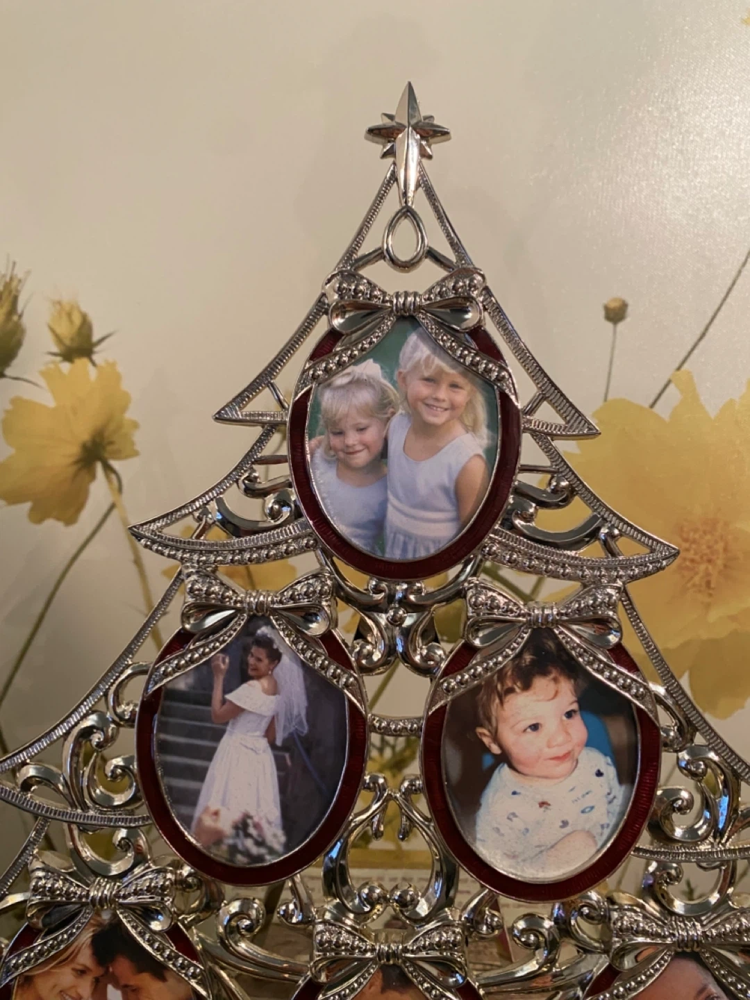 This festive photo frame is shaped like a Christmas tree and holds six small pictures. It's made of a silver-tone metal with a decorative filigree design. The inside of each photo oval has a deep red border. It's a lovely way to display cherished memories during the holidays! follow me @casa_s_decor