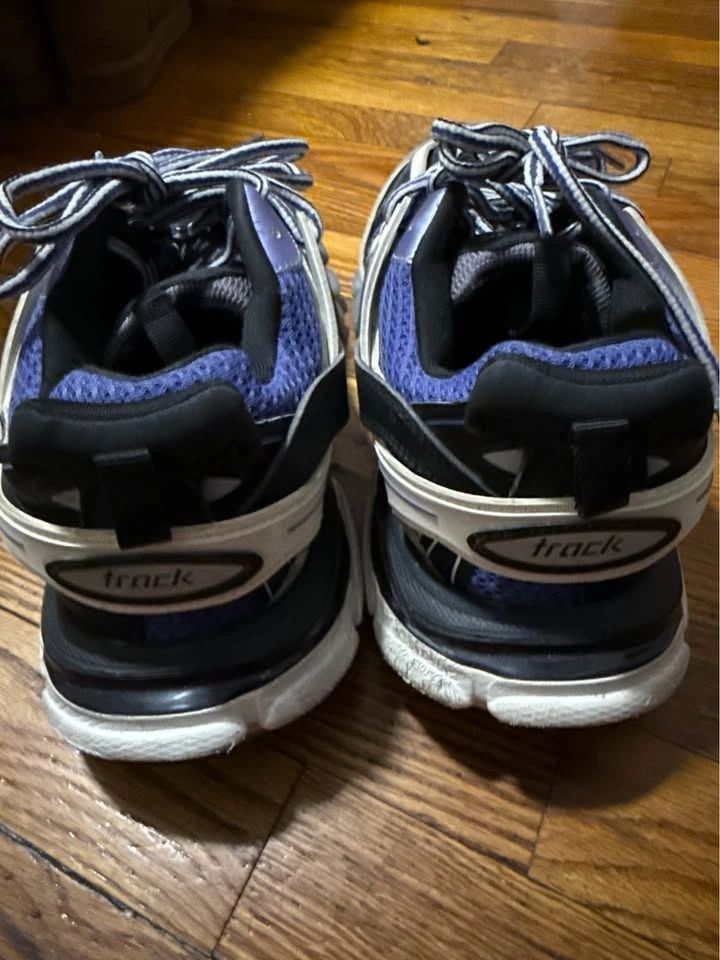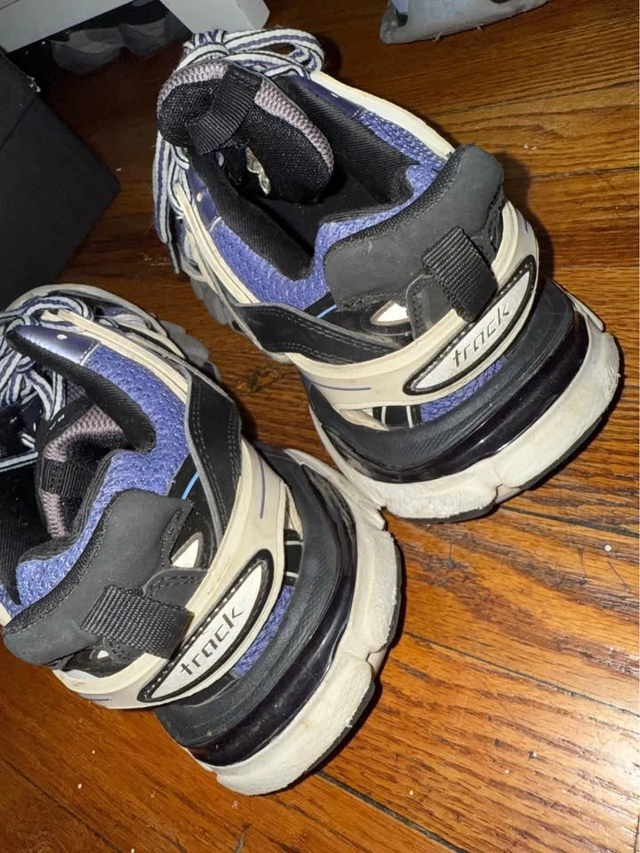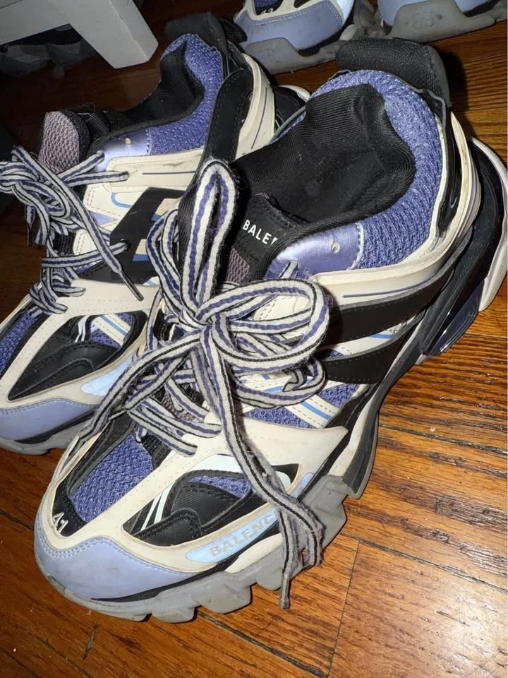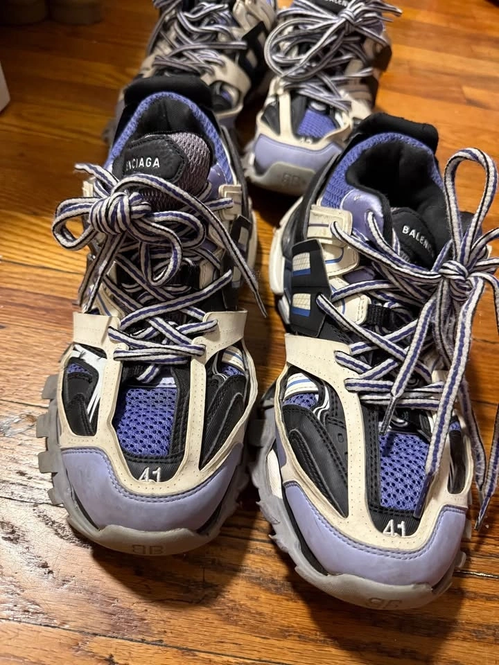 Two pairs of authentic Balenciaga Track sneakers for sale. Available sizes are US 7 and US 8. The colorway is grey, purple, and black. They are in good used condition with normal signs of wear, as shown in the photos.