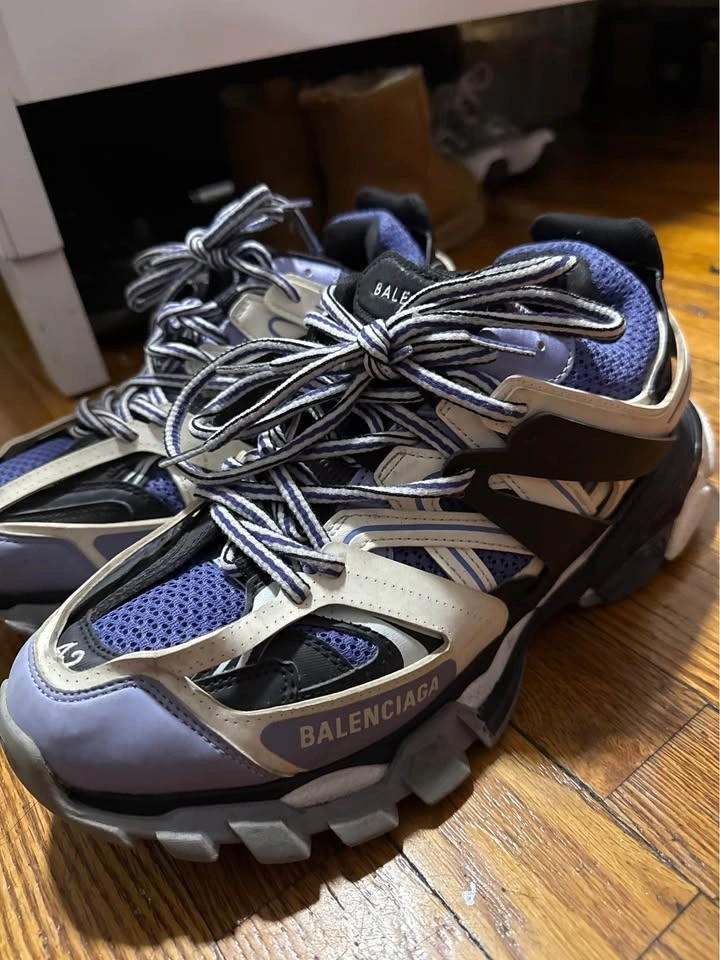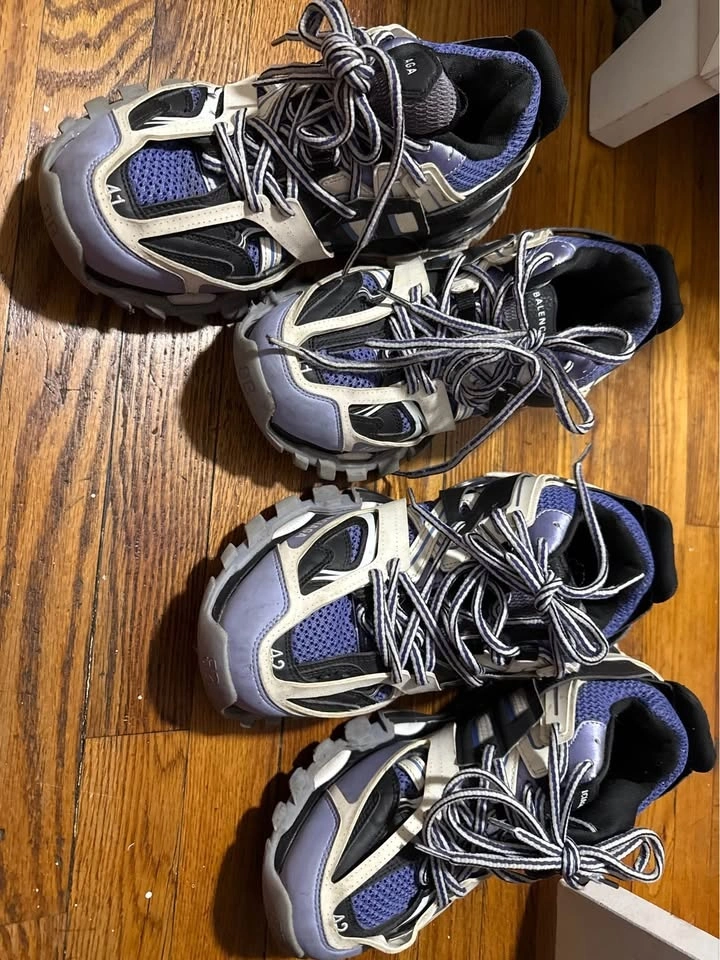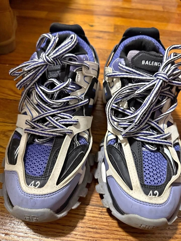 Two pairs of authentic Balenciaga Track sneakers for sale. Available sizes are US 7 and US 8. The colorway is grey, purple, and black. They are in good used condition with normal signs of wear, as shown in the photos.