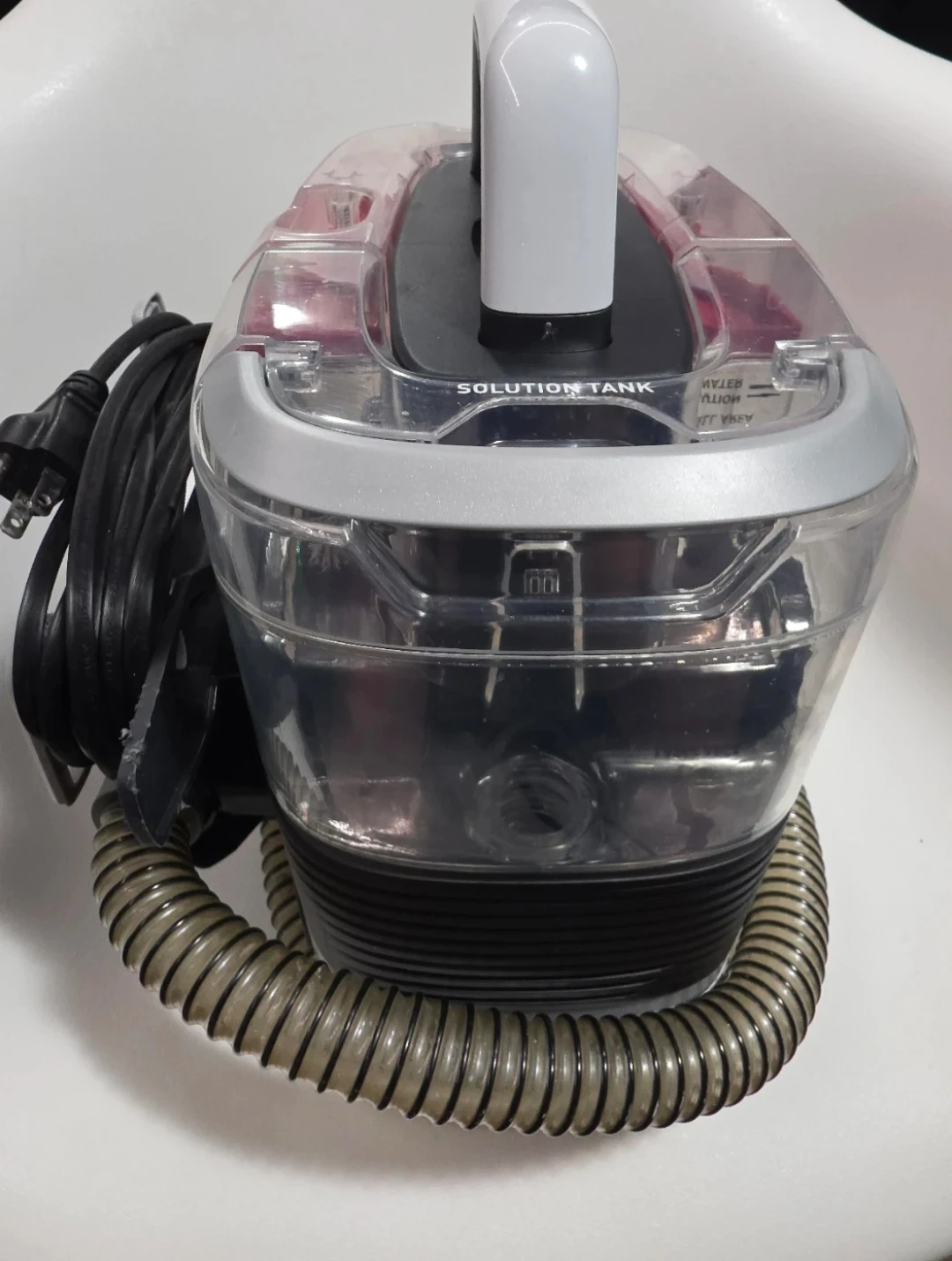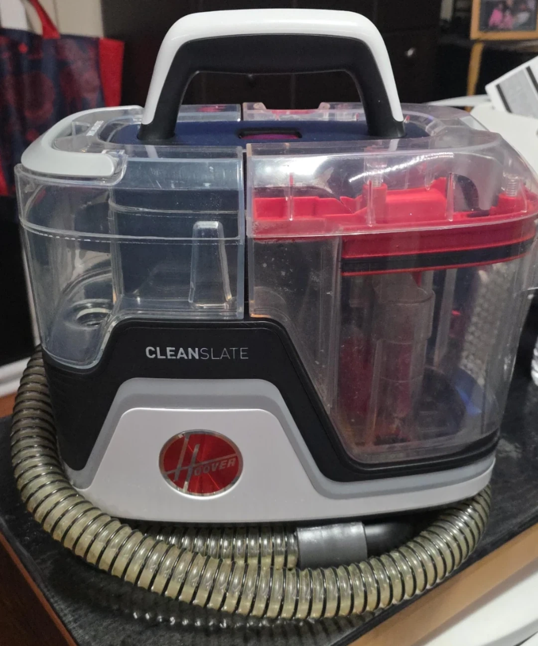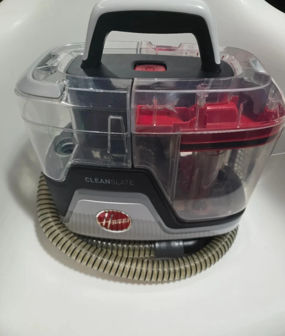 It's clean and ready for a new owner. This Hoover CleanSlate portable cleaner is excellent for tackling tough spots and stains on carpets and upholstery. It features powerful suction and a convenient hose-and-nozzle attachment for targeted cleaning. CleanSlate technology helps lift and remove messes effectively.