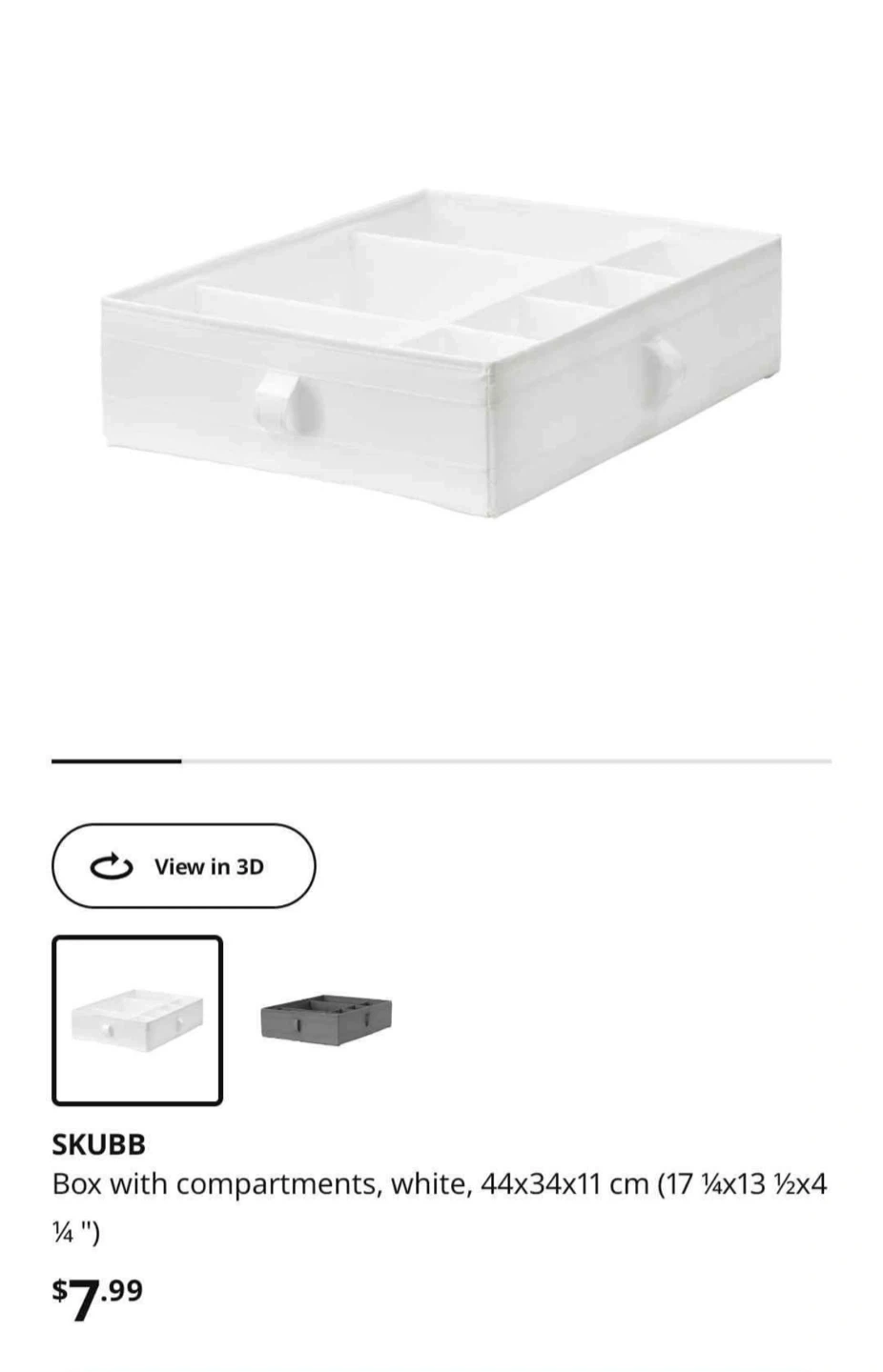 Buy & SellIKEA SKUBB Box with CompartmentsIKEA SKUBB Box with Compartments$5White fabric storage box with multiple compartments. Dimensions are 44x34x11 cm. It's great for organizing drawers and closets!WHERE TO MEETCheck LocationView MapSELLERGladisDowntown8510 reviews0 chats·1 favorites·26 viewsSEND CHAT TO SELLERHi Gladis! I’m interested in your listing.Hi Gladis! I’m interested in your listing.Get the Karrot app to chatSign In to chat