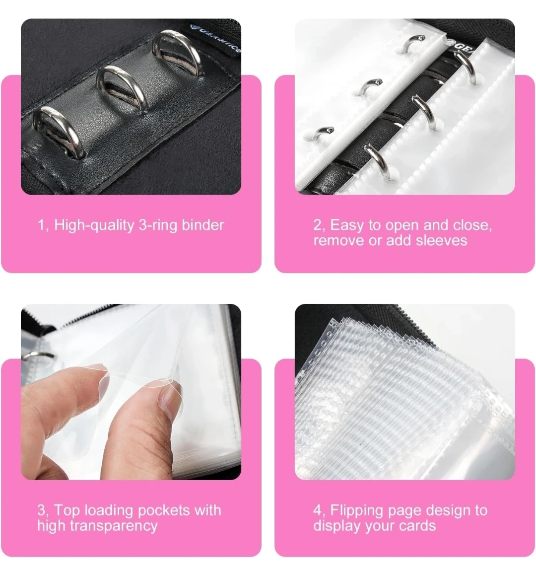Compact card binder album, perfect for holding up to 32 cards. It features a high-quality 3-ring binder with easy-to-open rings and top-loading pockets. The flipping page design offers high transparency for displaying your cards.