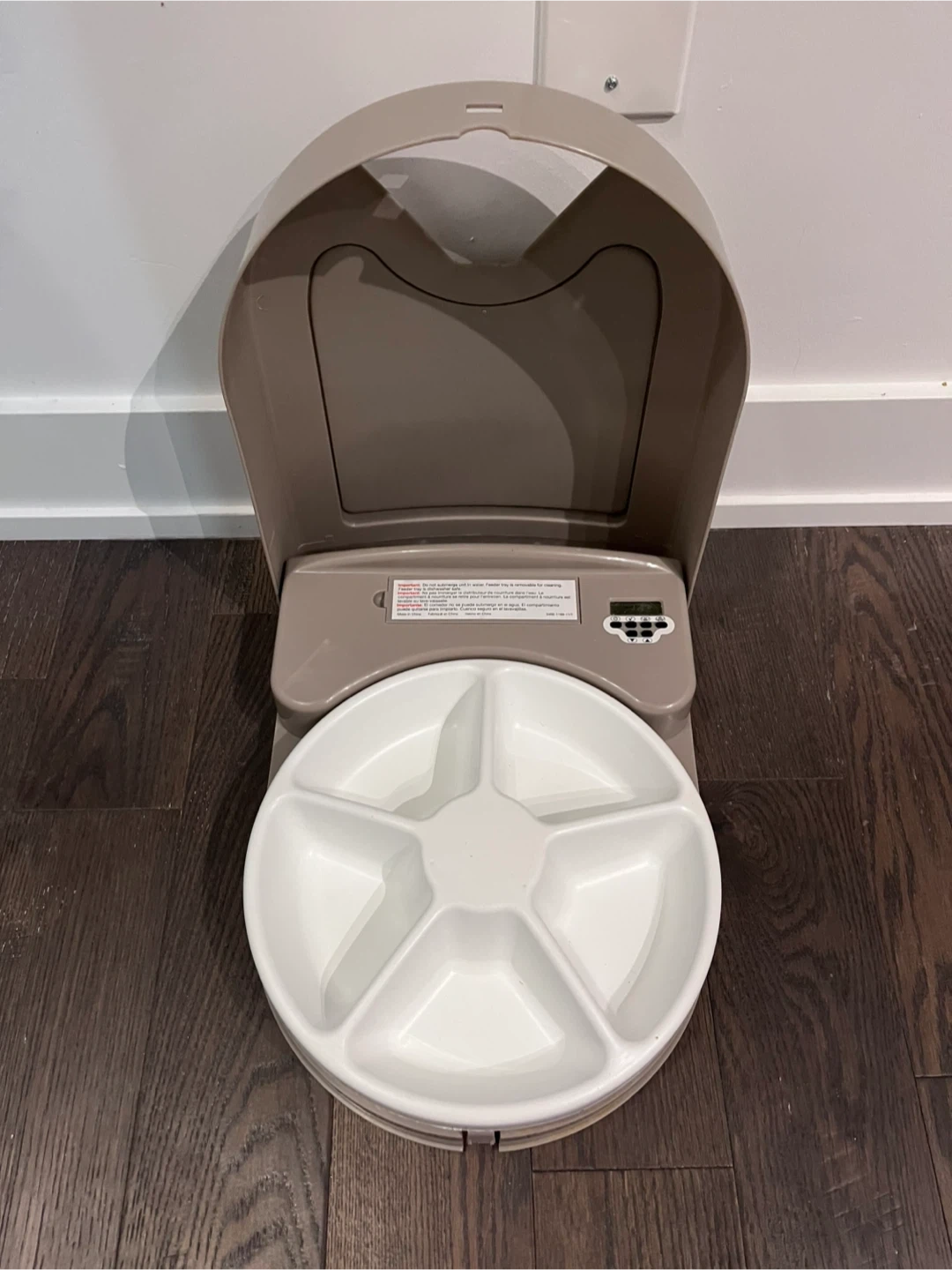 PetSafe automatic feeder can hold up to 5 meals/servings and can be programmed to spin at specific times. Suitable for cats or a small dog. It's perfect for portion control, for pets on a strict feeding schedule, or for leaving your pet overnight or for a weekend away.