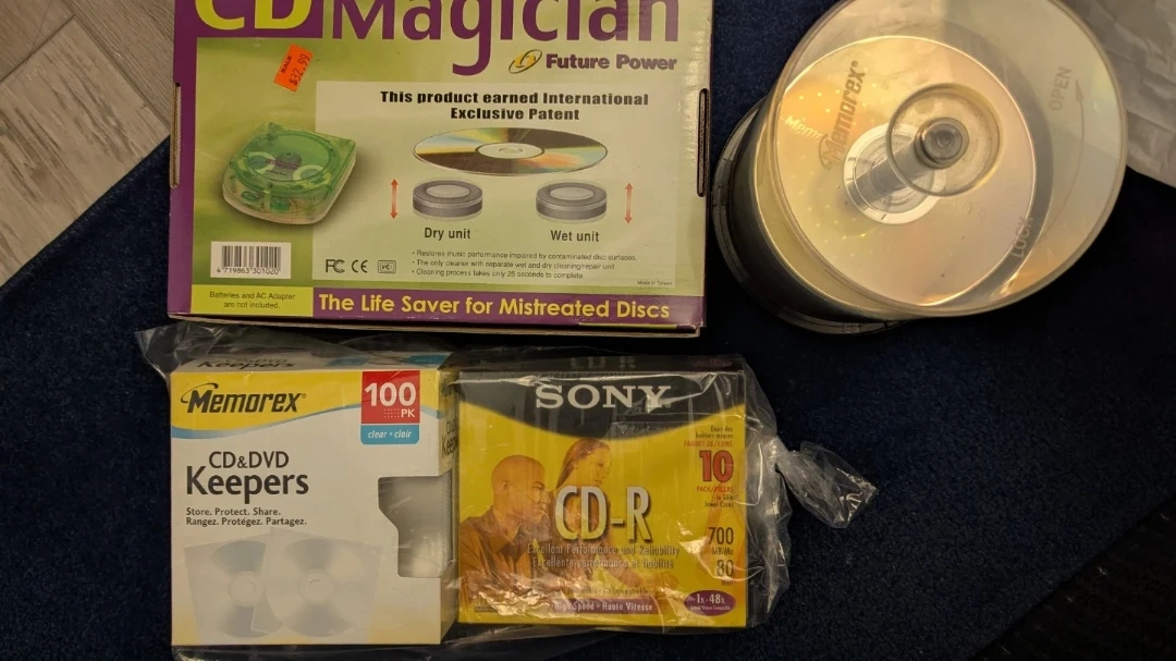 Restore mistreated discs with the CD Magician cleaner. Includes a 70-pack of Memorex DVD-R discs and a 9-pack of Sony CD-R discs. Keepers store and protect your discs.