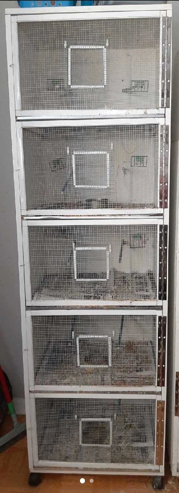 Handmade, good quality 5-in-1 bird cages. Each cage is 20"x16"x12", with a total height of 63". They have 4 wheels and are designed to save space. Everything has to go, last price.