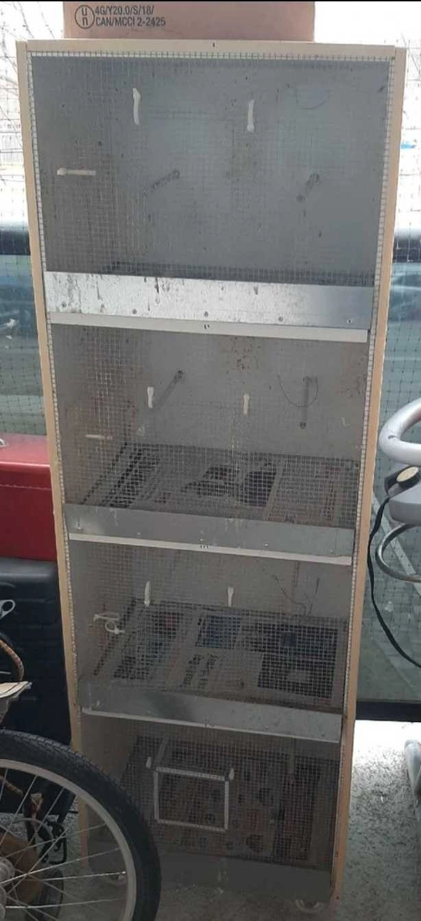 4 cages in one. Hand-made, good quality, and space-saving. It has 4 wheels. Each cage measures 17.5" x 12" x 8.5", with a total height of 53". Good for canaries and finches.