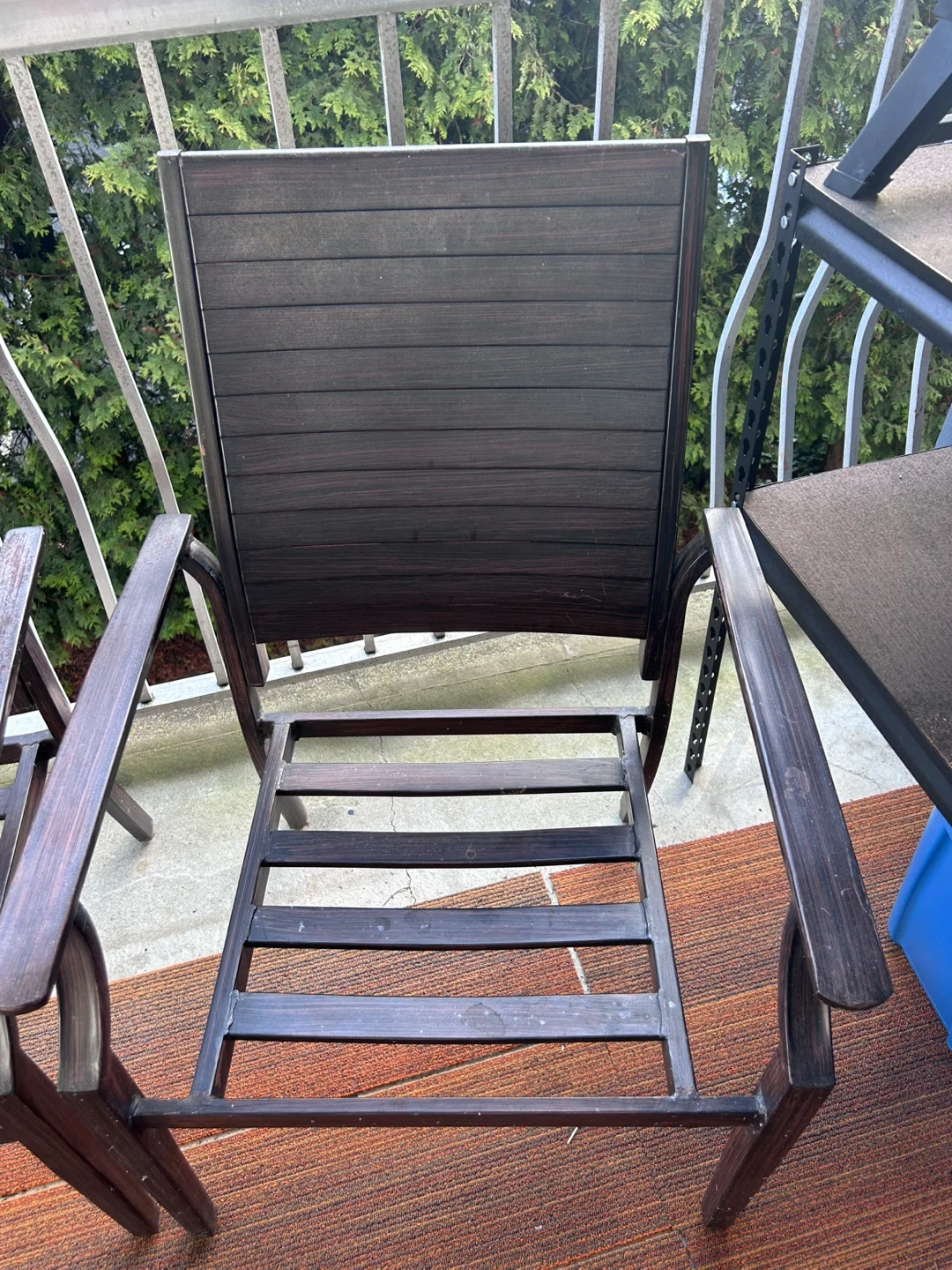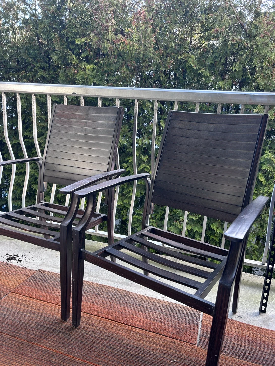 This is a set of two dark brown outdoor chairs. They're made of metal with a slatted seat and back. These chairs would be a nice addition to a patio or balcony. very sturdy.