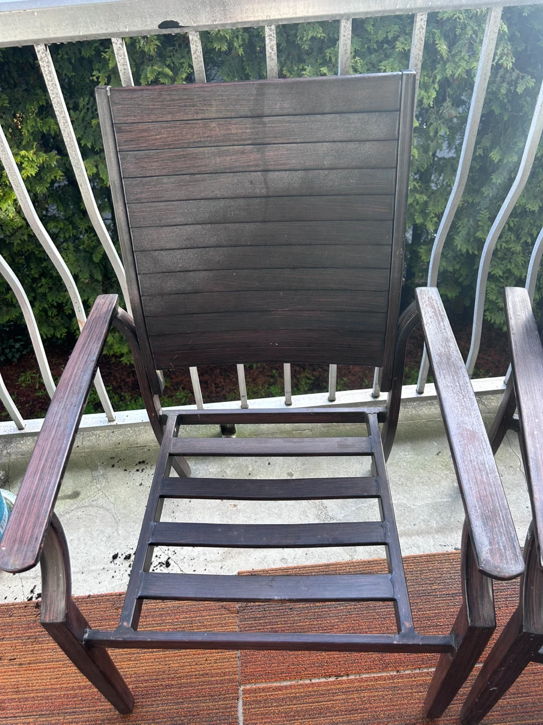 This is a set of two dark brown outdoor chairs. They're made of metal with a slatted seat and back. These chairs would be a nice addition to a patio or balcony. very sturdy.