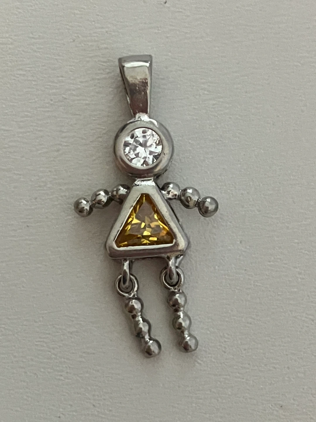 A cute silver pendant shaped like a child. It features a clear cubic zirconia in the head and a citrine stone in the torso. The bail is stamped with '925'.