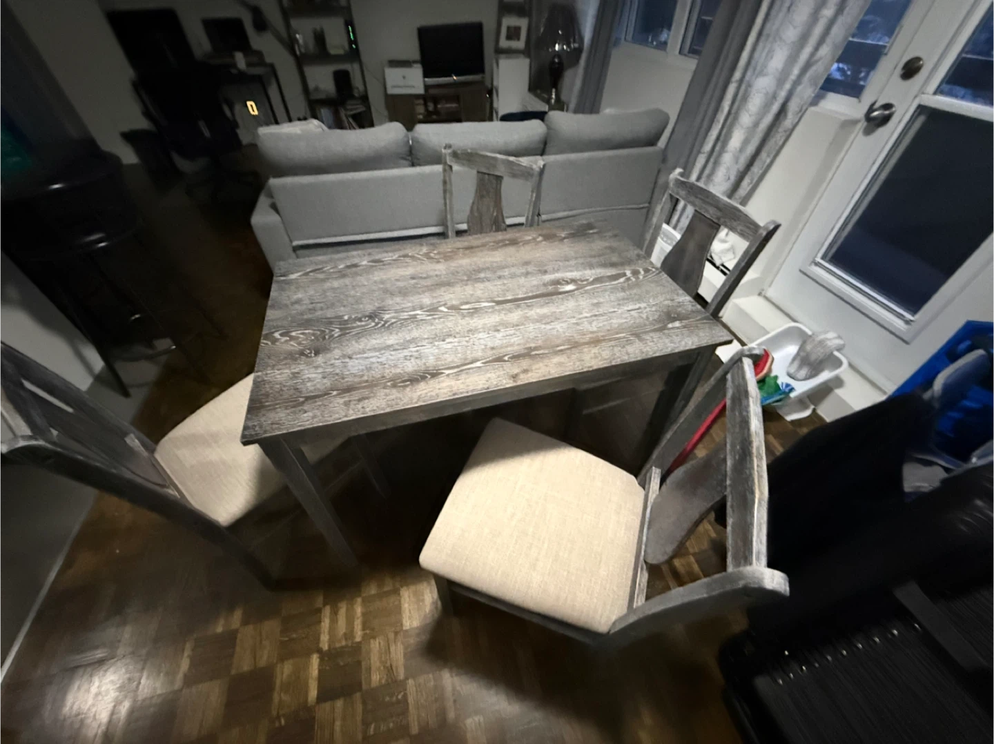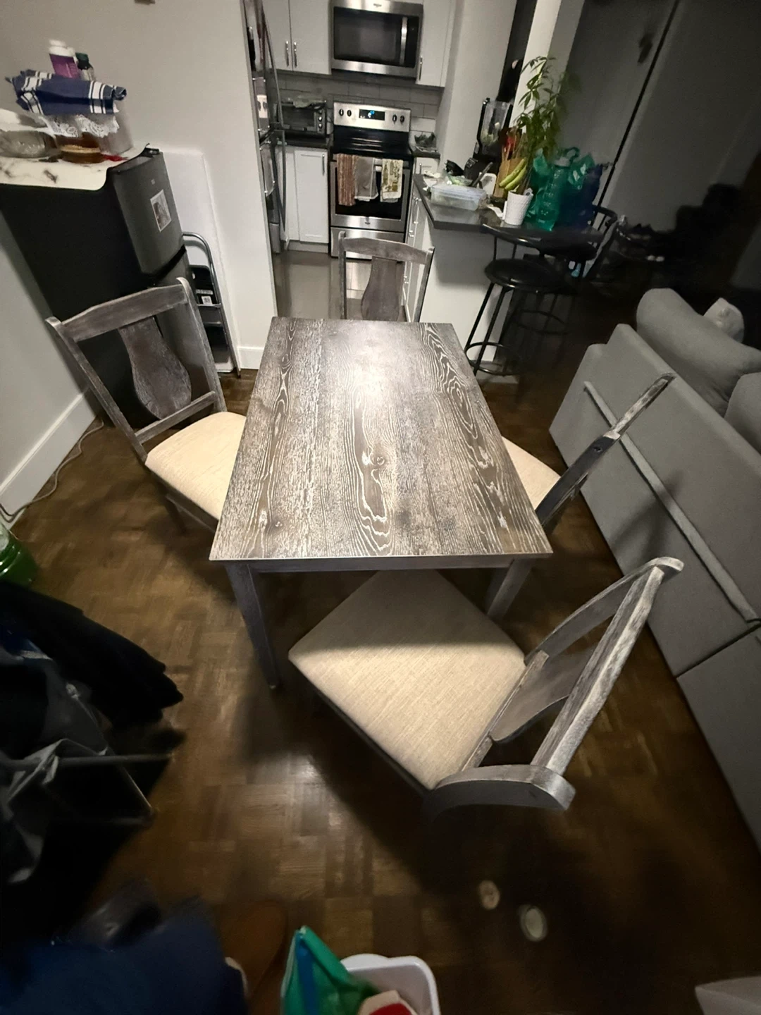 A four-piece dining set featuring a rectangular distressed wood table and four upholstered chairs. Chairs have light beige fabric seats and backs with a grey wash wood frame. Perfect for a small dining area or kitchen nook!