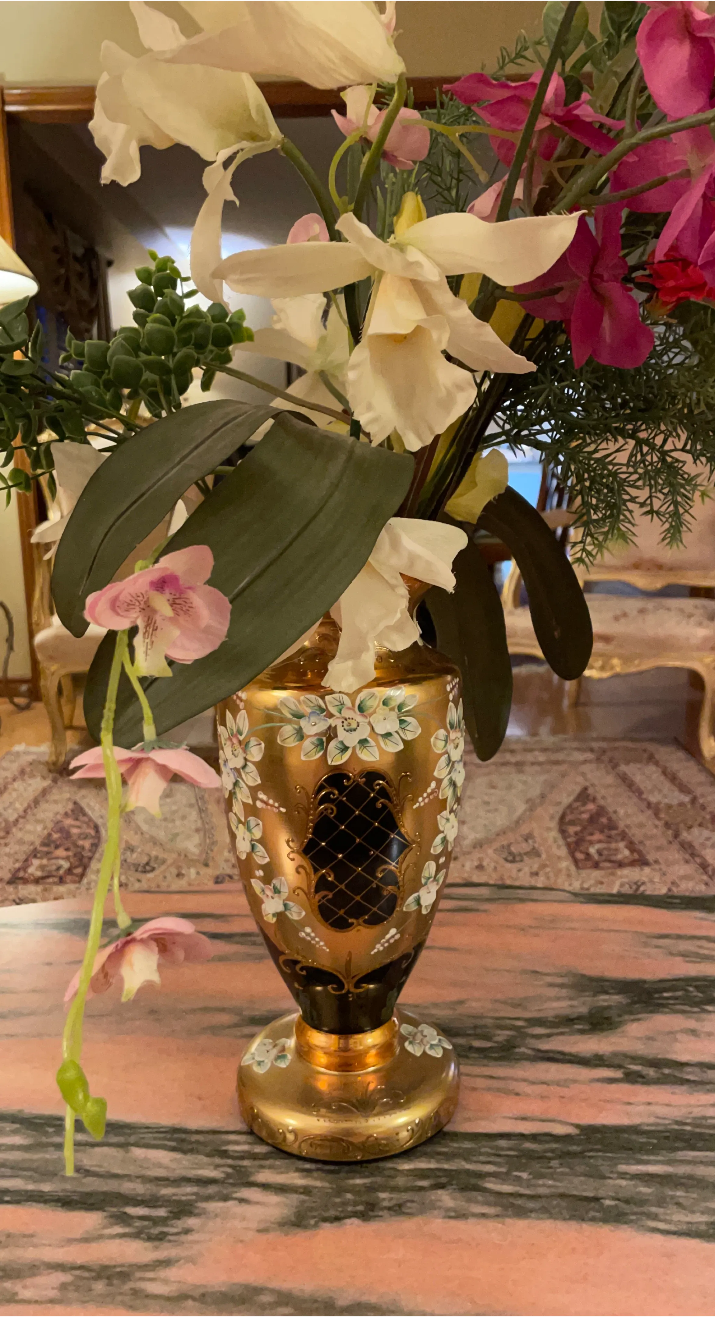 This beautiful gold vase features hand-painted floral designs with intricate detailing. It has a classic shape with a decorative black mesh insert. The vase's rich gold finish and detailed artwork make it a statement piece for any room. It's perfect for displaying fresh flowers or as a standalone decorative item.