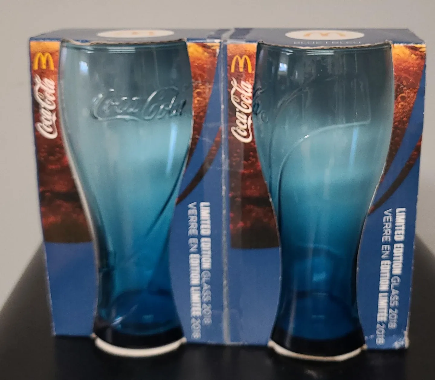 Set of two blue Coca-Cola limited edition glasses from 2018. These glasses have the Coca-Cola logo embossed. Great for enjoying your favourite beverages!
