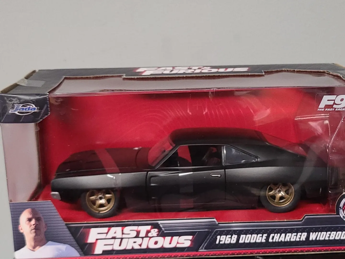 This is a Jada diecast model of the 1968 Dodge Charger Widebody from Fast & Furious. It's a 1:24 scale replica. The model is black with gold rims. Includes original packaging.